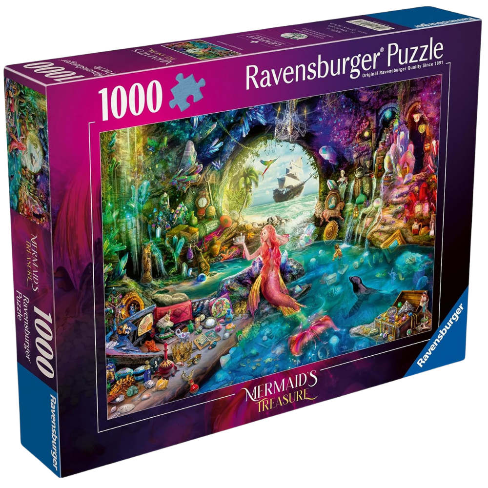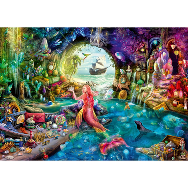 Embark on an underwater adventure with this captivating 1000-piece jigsaw puzzle. The scene transports you to a hidden cave, where shimmering treasures lie scattered among vibrant coral and mysterious sea creatures. A beautiful mermaid gazes at the glimmering jewels, surrounded by the wonders of the deep. In the background, a pirate ship sails by, its sails billowing in the ocean breeze, hinting at tales of adventure and exploration.