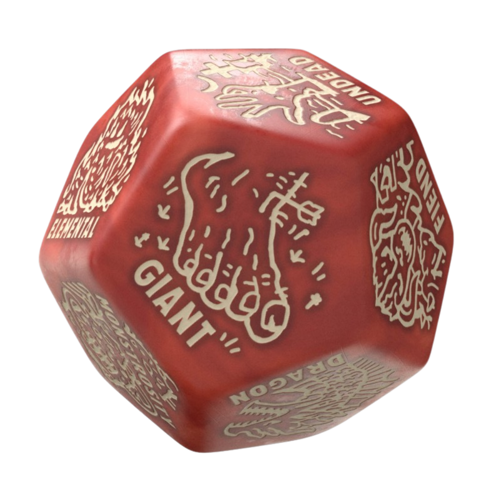 No encounter prepared? We've got you! The Monster Generator Die is a jumbo D12 designed by Viridian Dice, used to conjure a monster on your players' path. Randomisation speaks volumes! Each use summons possibility — from Dragons and Fiends to Oozes and Undead — twelve chances to decide what will stalk the party next.