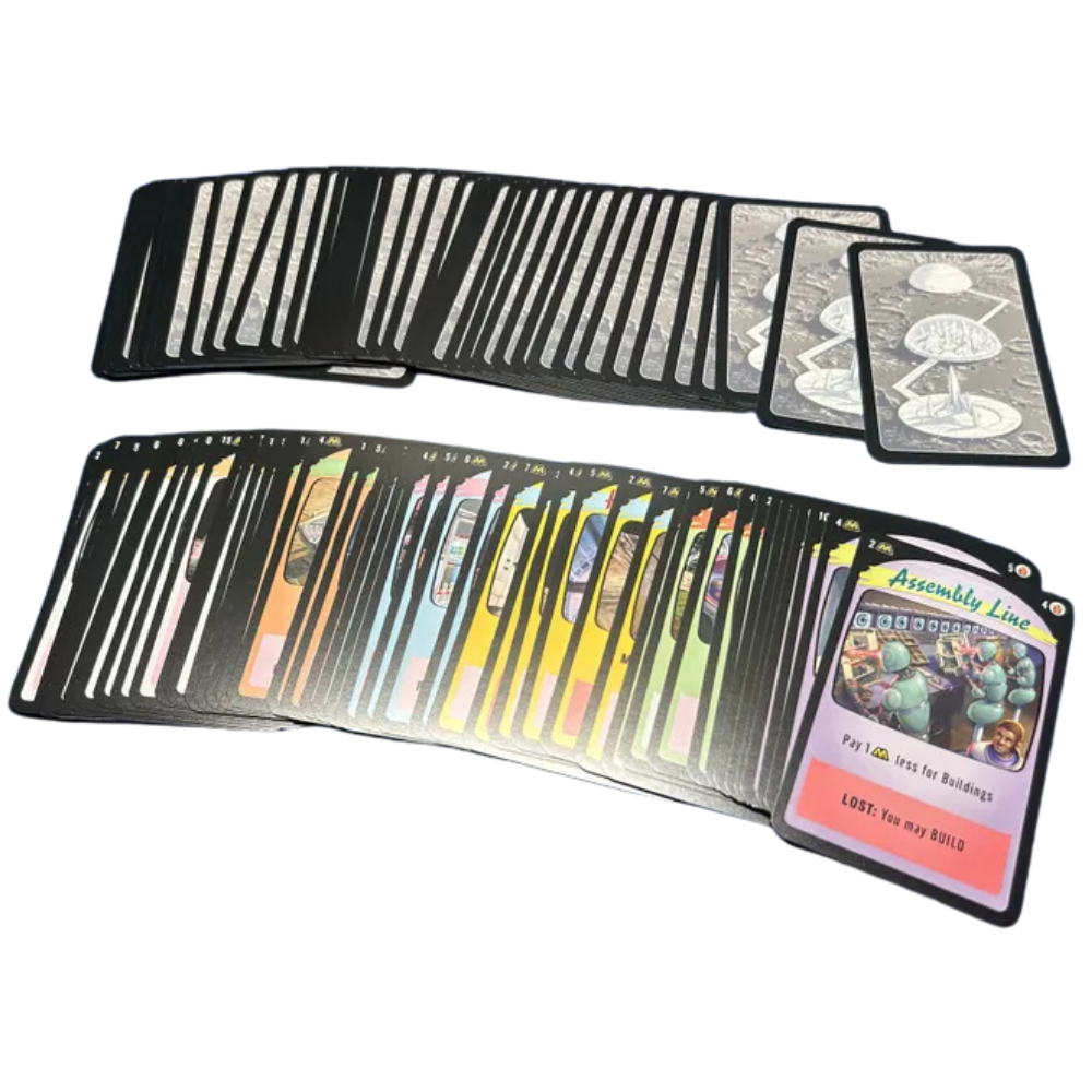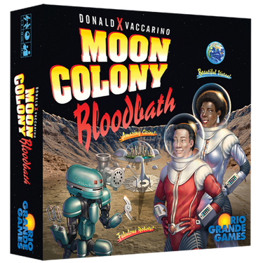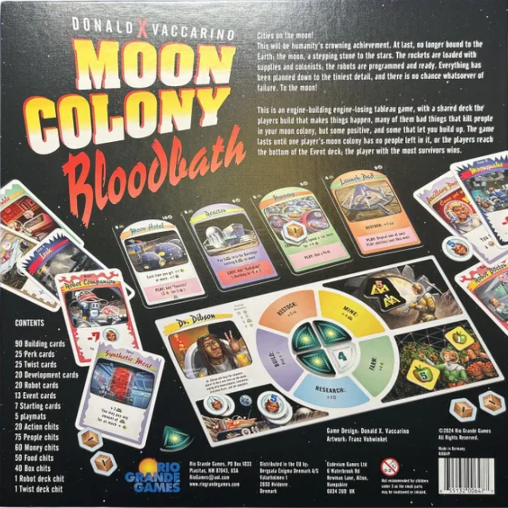 Moon Colony Bloodbath is an engine-building, engine-losing tableau game, with a shared deck the players build that makes things happen, many of them bad things that kill people in your moon colony, but some positive, and some that let you build up.