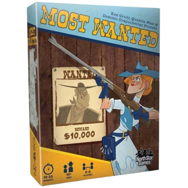 Most Wanted is a poker-style game that will get your friends bluffing, cheering, and talking in accents. On your turn, choose one of six possible actions: There are three robberies that anyone can participate in, two actions that further your position by replenishing cards or money, and one action where you challenge another gunslinger to a high-card duel. The only way to get points is to take a risk with a robbery (and the penalty for failing is small), so don't be shy… the next heist could be your lucky break!