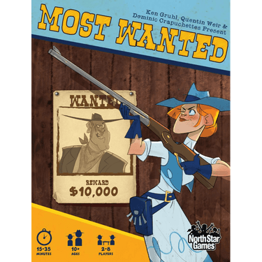 Most Wanted is a western-themed game where fellow bandits compete to become the most notorious outlaw of the land. Playing the best hand - or bluffing with the worst – could mean the difference between a successful train robbery or time spent in the slammer. Players can repent at church to make a new start, or even work some honest labor (gasp!) for bail money. Be the first player to 13 points and claim the dubious honor of being the MOST WANTED. Go get 'em, partner!