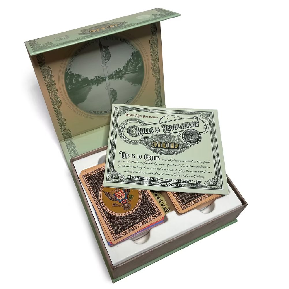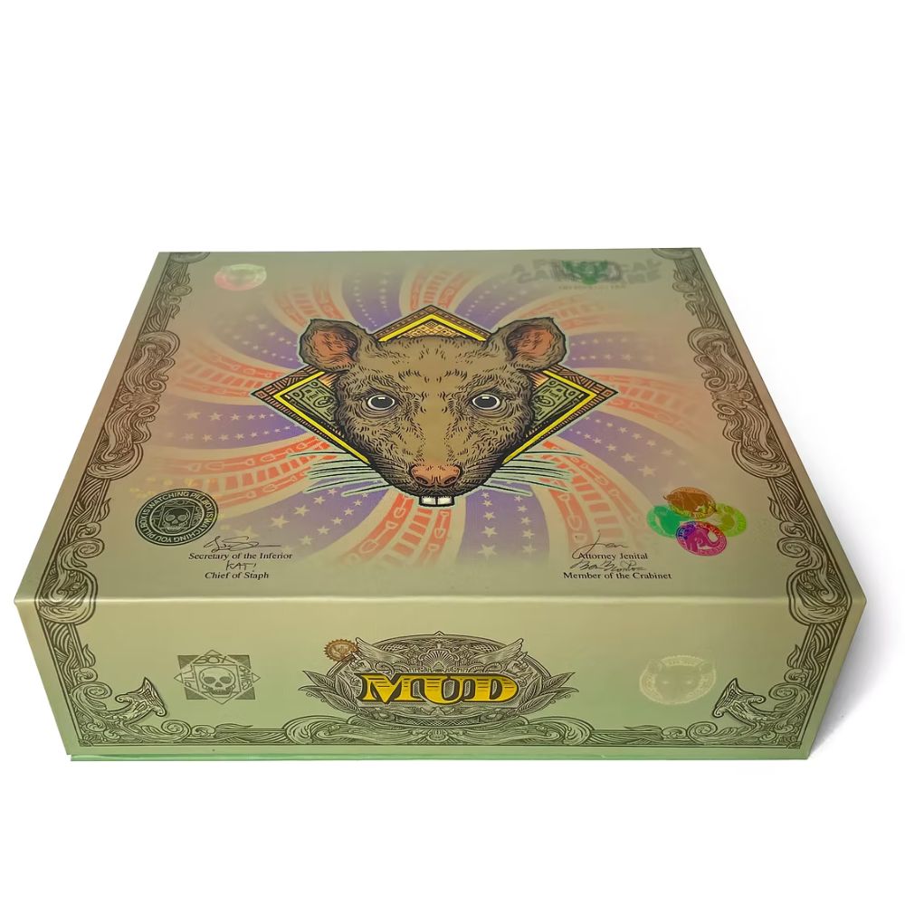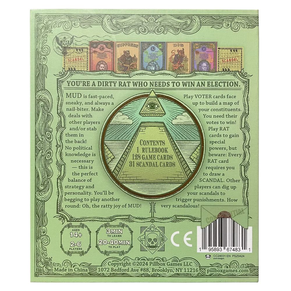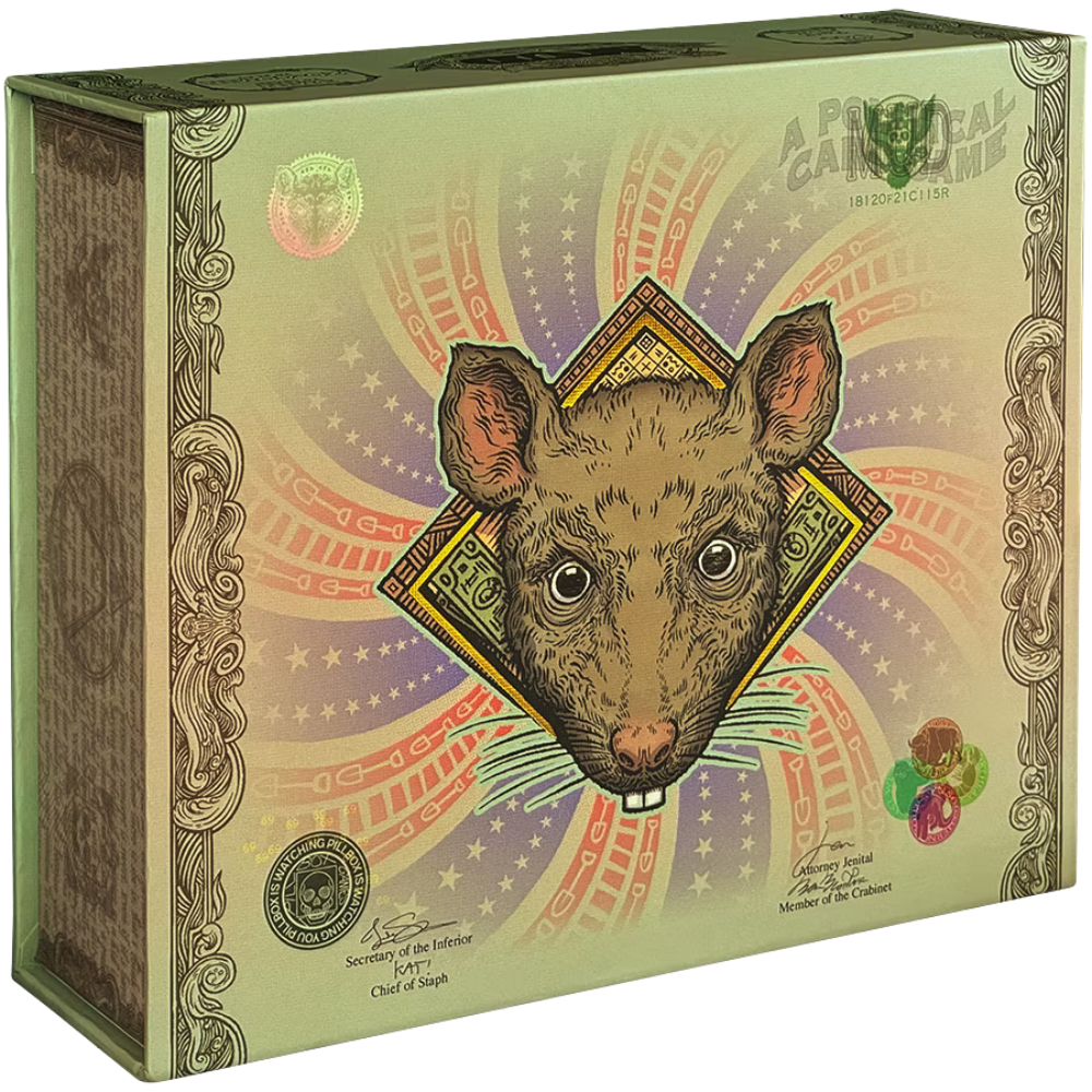 Peppered in the deck are RAT cards, which give you strong advantages. However, every time you play a RAT card, you must also draw a Scandal card, which contains a punishment. This punishment is not enacted immediately — rather, it sits face down in front of you until someone plays a DIG card on you. The DIG card will force you to turn over a scandal and abide by the punishment. Do you risk a scandal, or do you play it safe? The choice is yours in this dirty game of American elections.