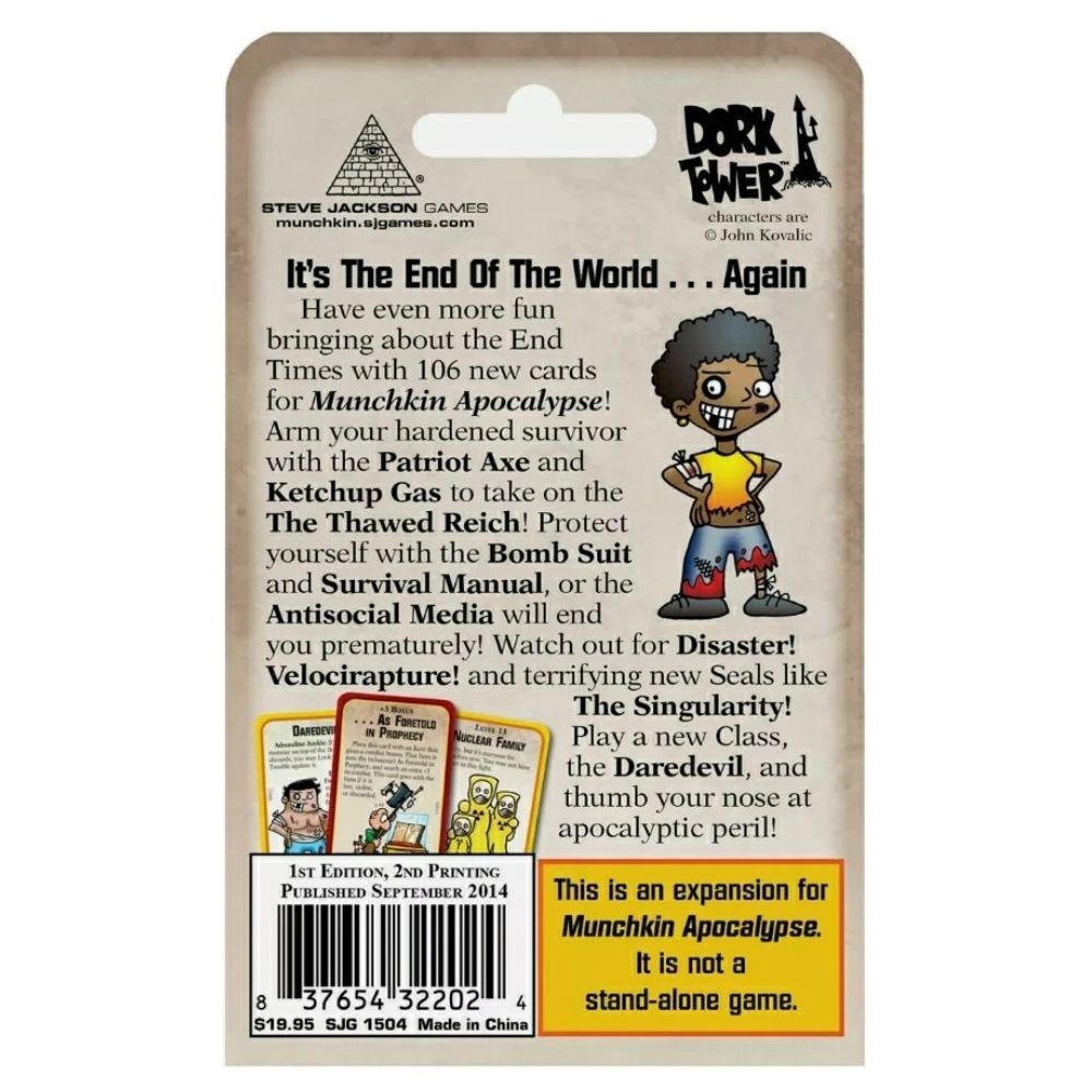 It's the end of the world...again. Munchkin Apocalypse 2: Sheep Impact is a 106-card expansion for Munchkin Apocalypse. Now you can arm your hardened survivor with the "Patriot Axe" and "Ketchup Gas" to take on the "The Thawed Reich"! Protect yourself with the "Bomb Suit" and "Survival Manual", or the "Antisocial Media" will end you prematurely! Watch out for "Disaster! Velocirapture!" and terrifying new Seals like "The Singularity"! Play a new Class — the Daredevil — and thumb your nose at apocalyptic peril!