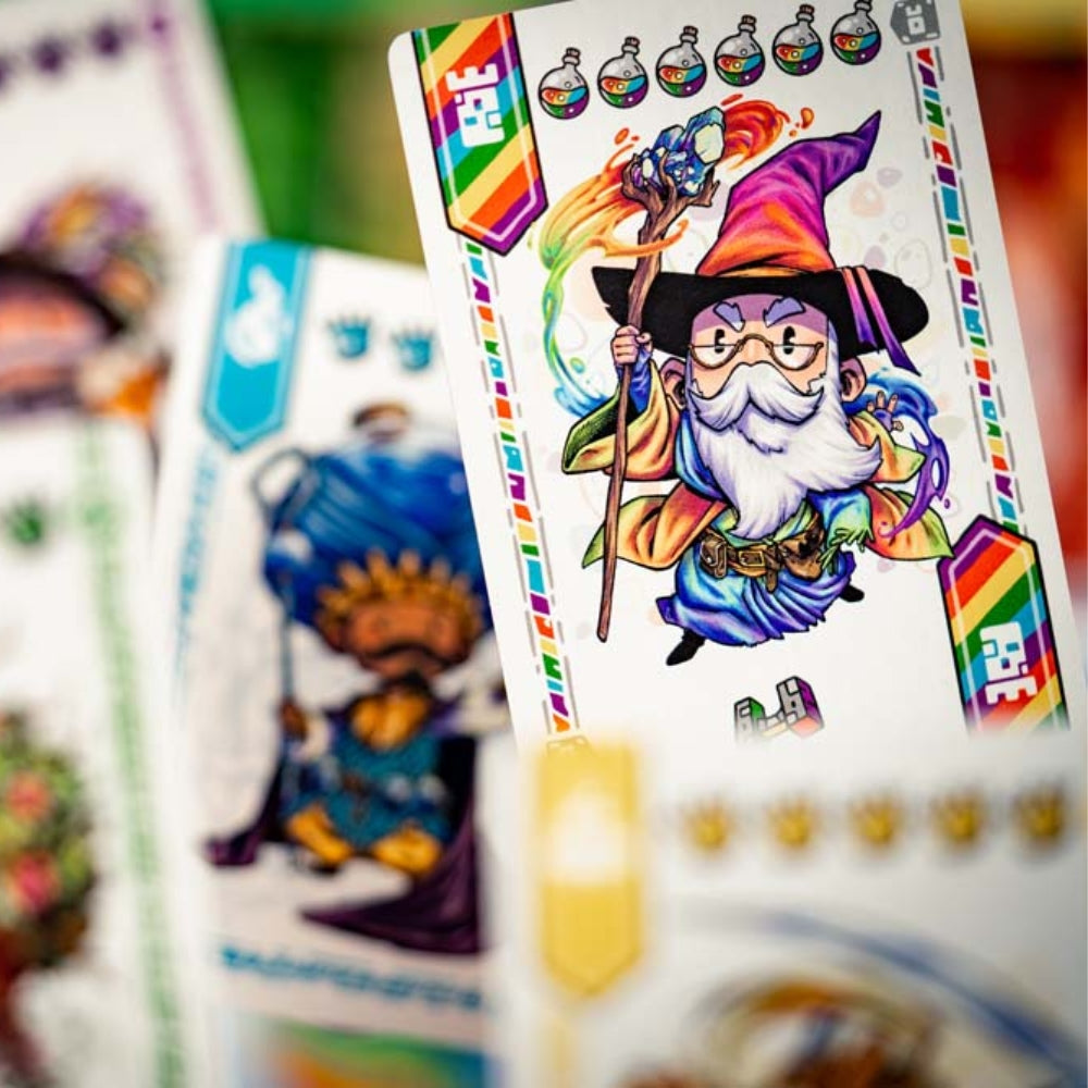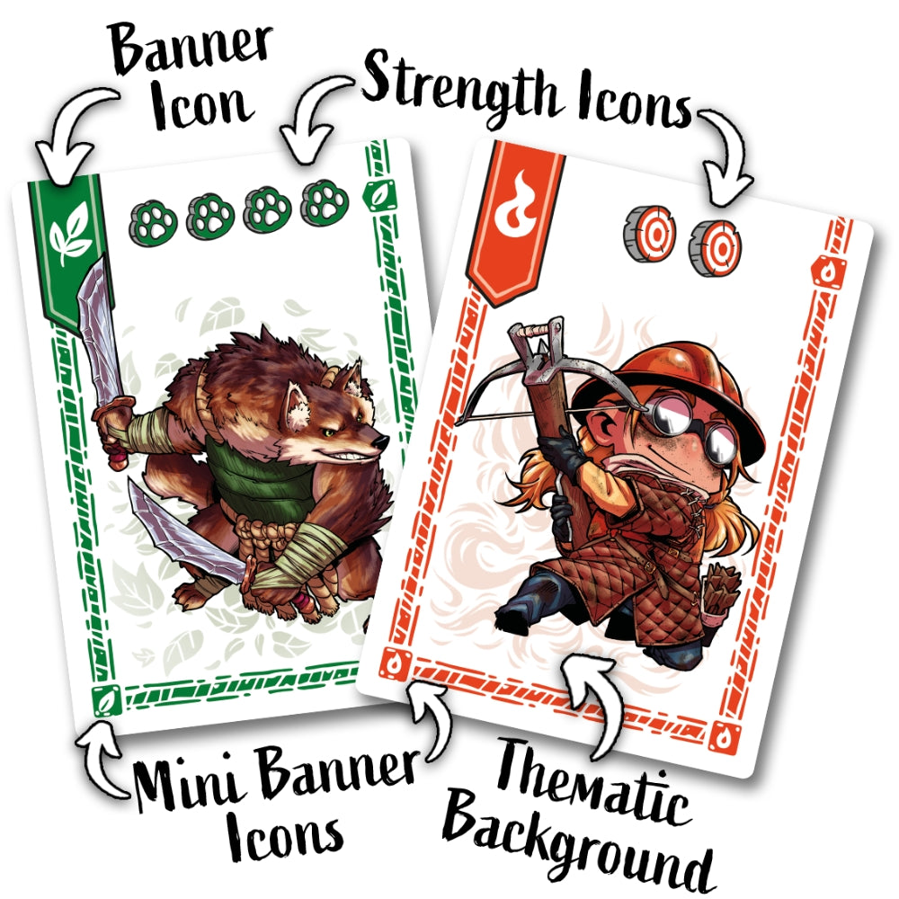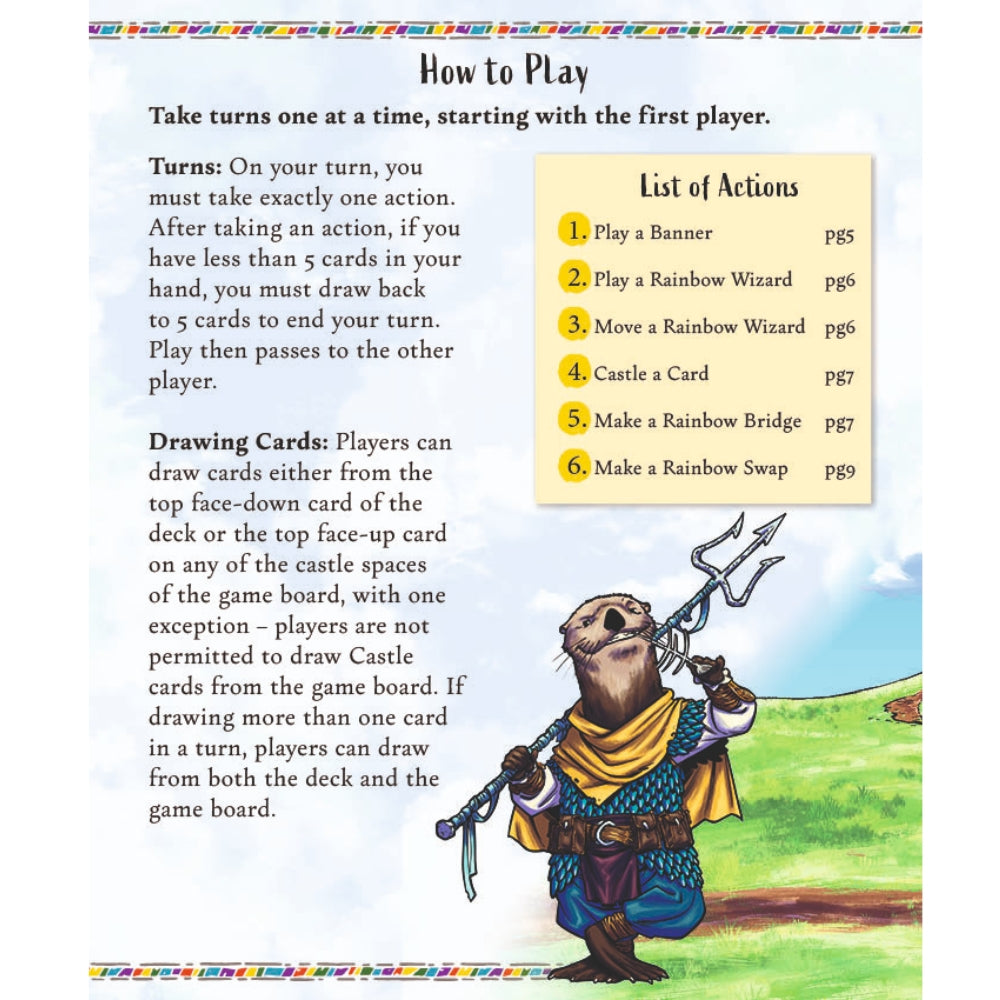 Step into the enchanting world of Muster, where players Raise the Banners and seize control of five majestic castles. Strategic planning and bold tactics will determine who emerges victorious in this fast-paced, two-player duel! Assemble a fearsome force drawn from five unique factions, represented by loyal soldiers, agile archers, valiant knights, fierce beasts, and legendary leaders. Unleash the magical power of Rainbow Cards to tip the scales - but beware! Rainbow Wizards are fickle friends whose loyalties can falter when you need them most