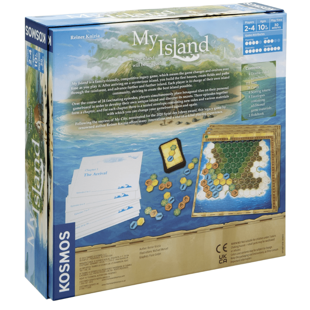 Modelled after 2020's My City, My Island is a competitive legacy game in which you develop your own unique island from connected hexagons.