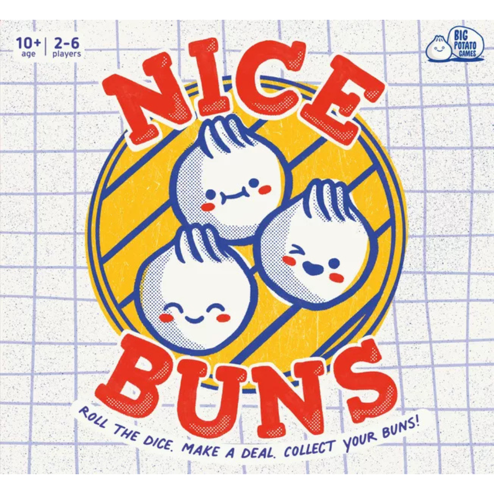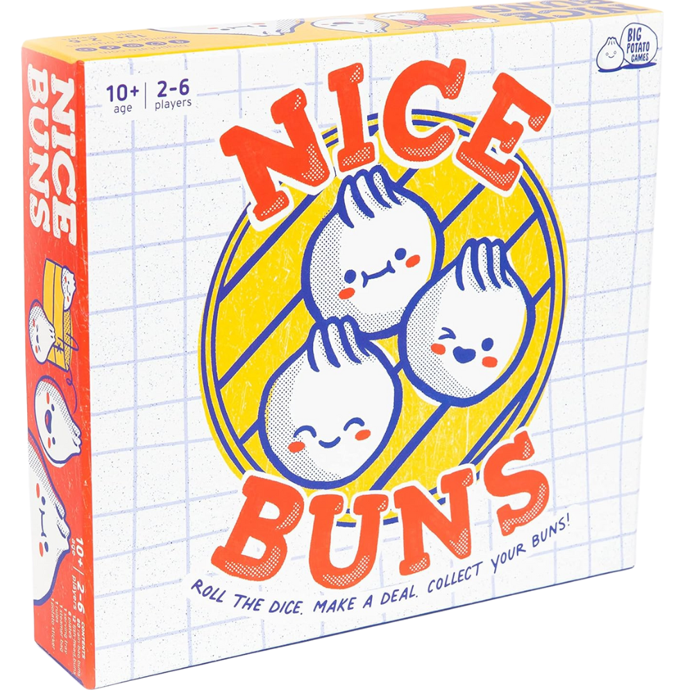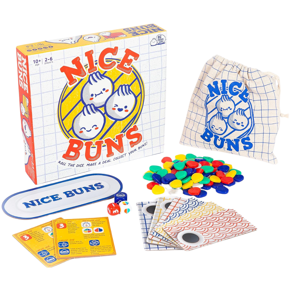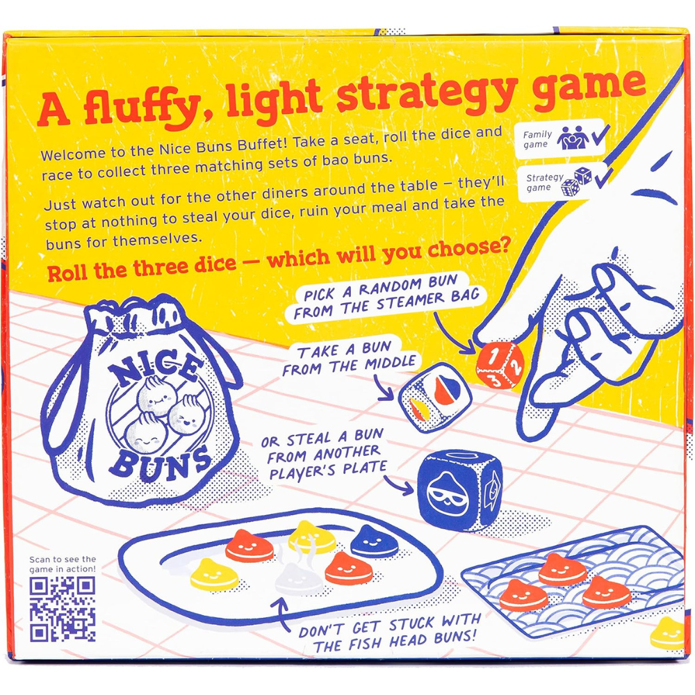 Nice Buns is a light strategy game in which players sit together in the "Nice Buns Buffet" and race to fill up their plate with three sets of colourful bao buns. Each round, you roll three dice that let you collect, steal, and trade different buns.