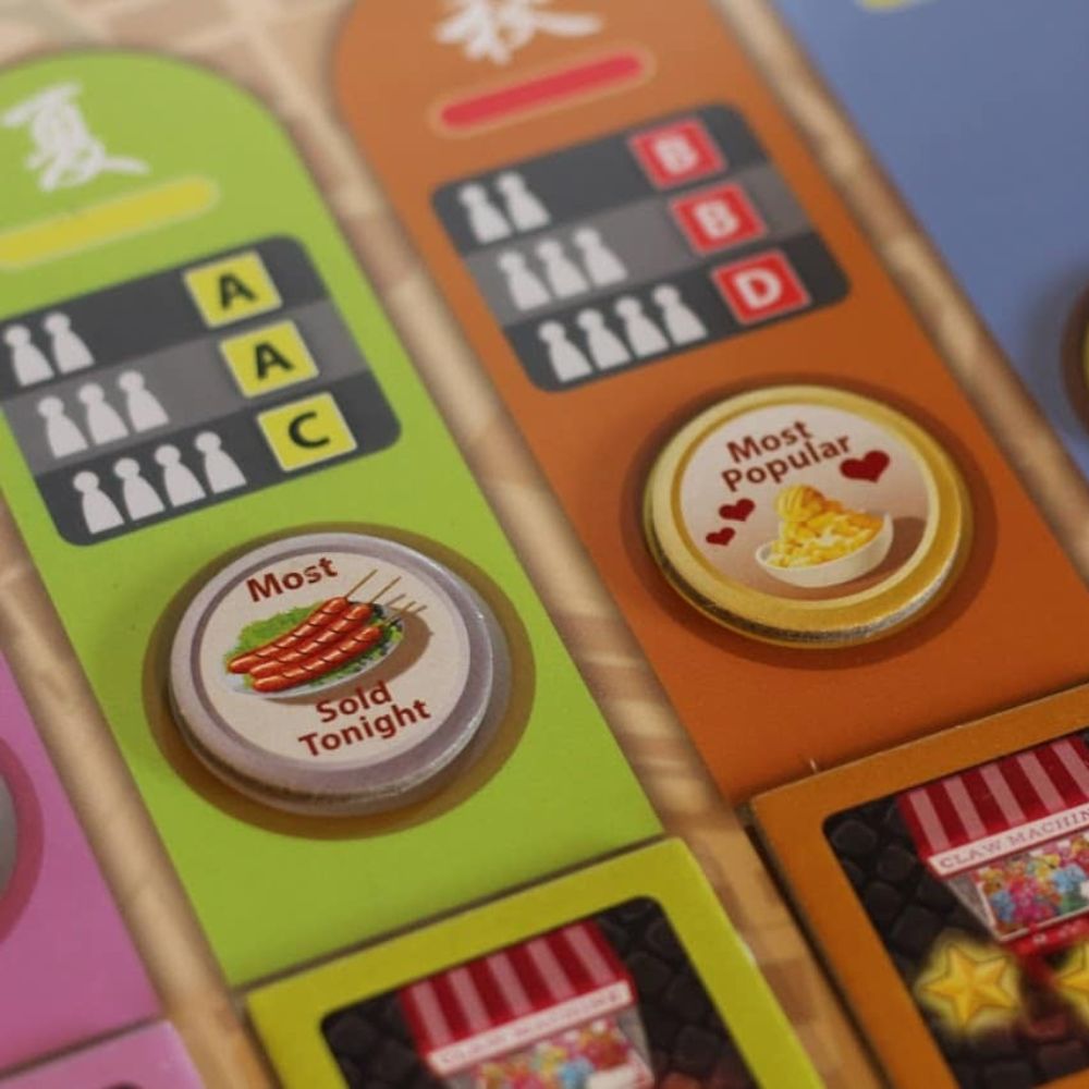 In Night Market, you are a business owner who is trying to construct stalls to sell food to customers with distinctive tastes. These customers will move through your night market looking for their cravings to be fulfilled. To capitalise, you must acquire different foods from the city and strategically place them in your night market to accommodate your customers. Furthermore, your customers are also seeking and are willing to pay more for specialty dishes. The challenge is you only have so much time to shop for ingredients and prepare for the market’s opening. Customers that are satiated, will become loyal customers and come back for another visit. Customers that are disappointed, will leave. Night Market couples a spatial worker placement mechanism with challenging resource management to maintain customer loyalty resulting in sales. At the end of the game, the player who has earned the most reputation will be regarded as the “Best Night Market”.