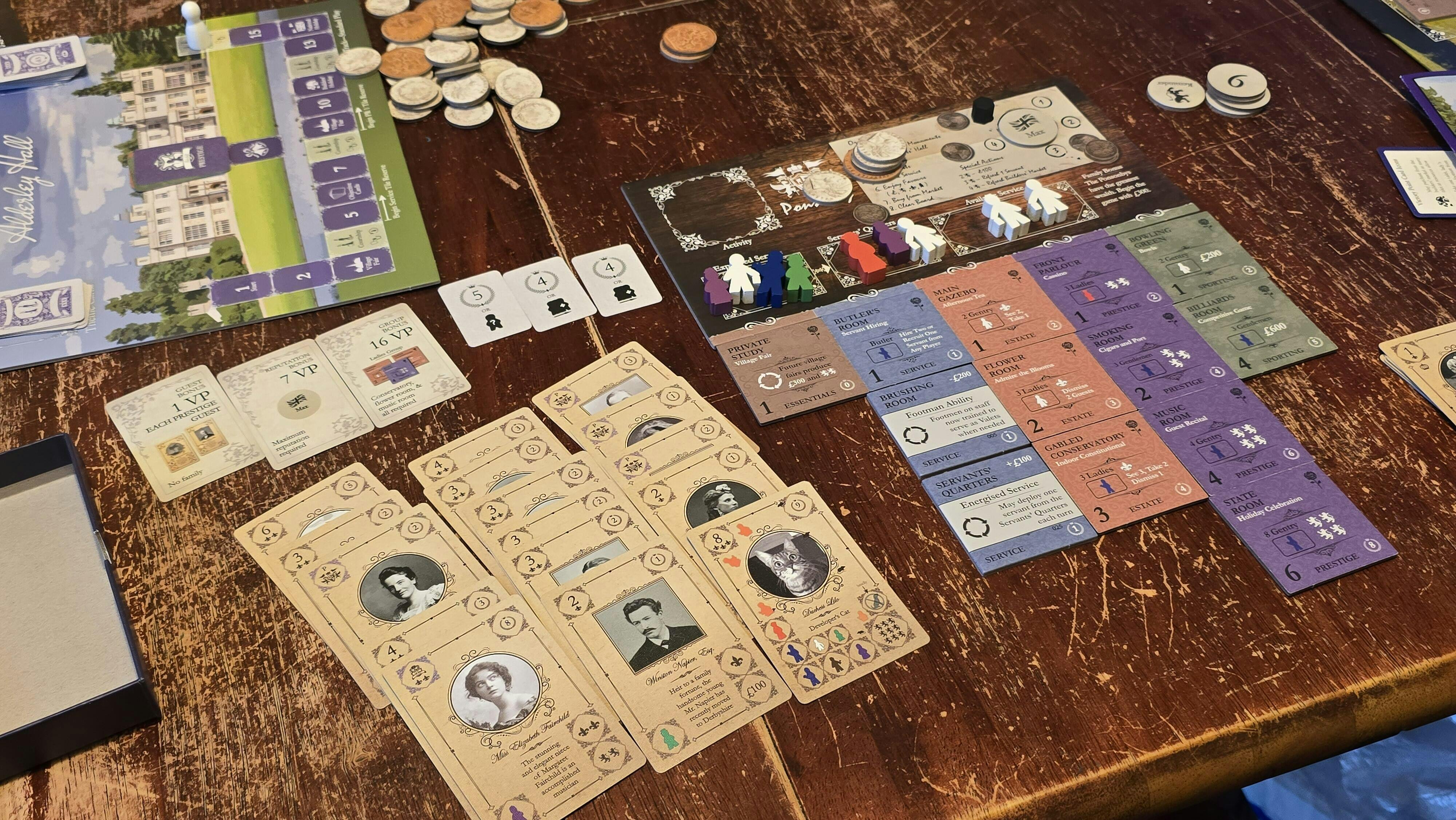 Each turn, players choose a building tile representing a room or outdoor space in and around their 19th century British country house. The tile chosen dictates the event that can be hosted and the guests to be invited. Players must carefully plan, however, to have the proper staff available to service the event and support guests as needed. The reward for success is new investment opportunities, permitting further renovation of the estate (acquisition of more valuable/powerful building tiles), an increase in reputation in the county, an expanding circle of influential acquaintances, and a larger and highly-trained domestic staff.