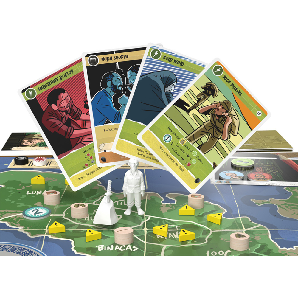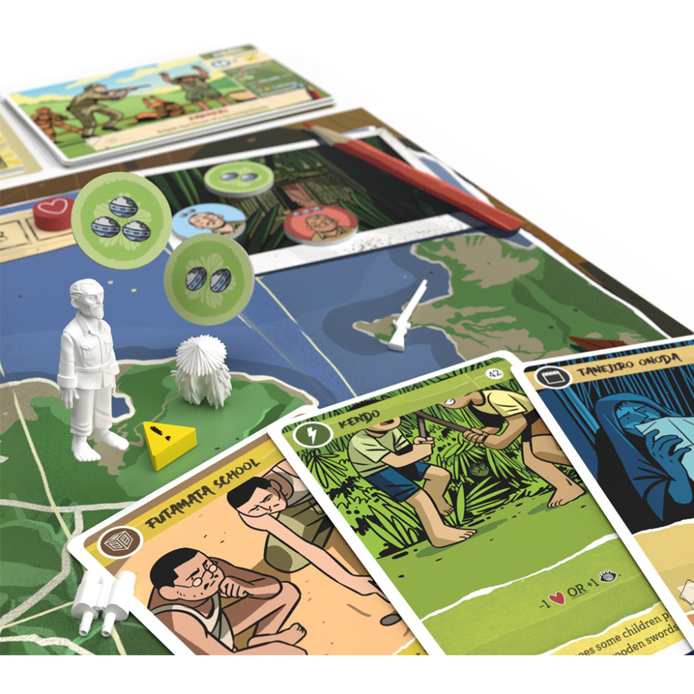 During six rounds of variable duration, you have to obtain a number of resources that will allow you to finish the turn without suffering penalties. In each round, you will also undertake a mission, earning honor points for it. During your adventures, you will experience some of the events that the real-life Onoda had during his stay in Lubang. If you manage to overcome the six rounds without going insane due to paranoia or dying due to ill health, it will be time to see whether you will be recognized a hero or fade into oblivion.