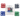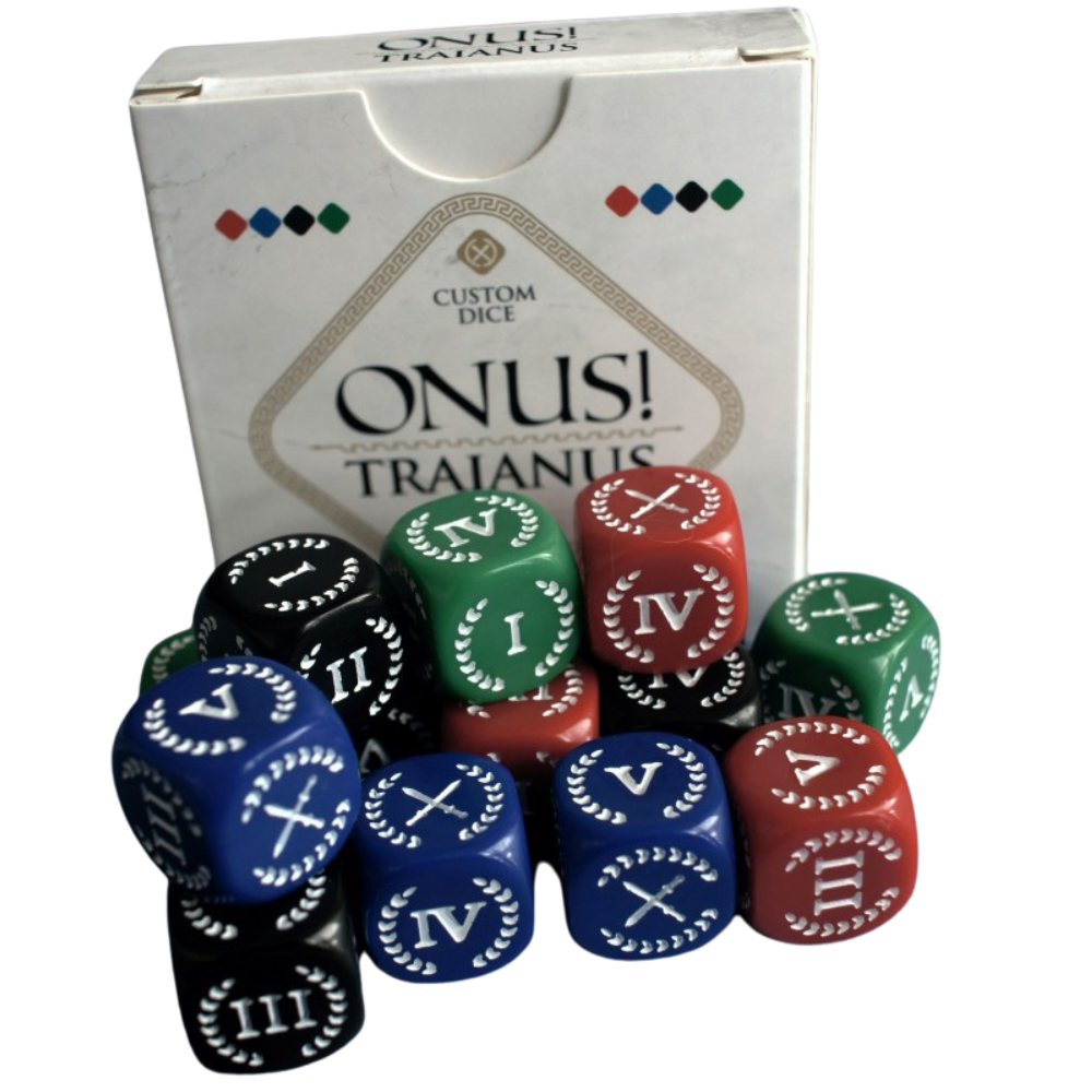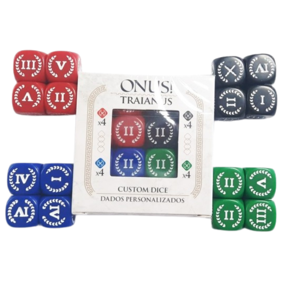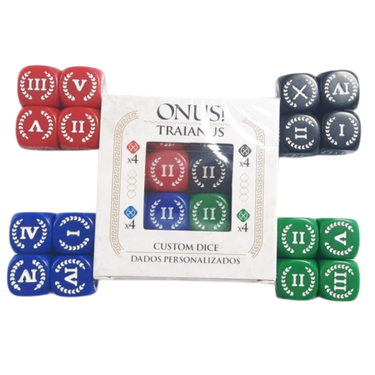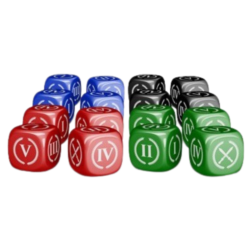 Set of 16 customised dice with 16mm sides and rounded corners in 4 different colours. 4 blue, 4 red, 4 black and 4 green.