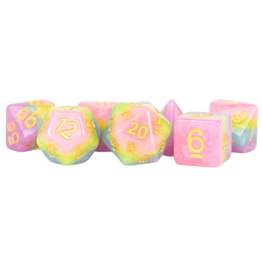 Bring a touch of magic to your tabletop with the Pastel Fairy Dice Set. Swirled in soft pastel hues of pink, yellow, green and blue, these resin dice evoke the whimsy of a fairy glade at dawn. Each die is finished with clear, golden numerals for easy reading and an enchanting look.