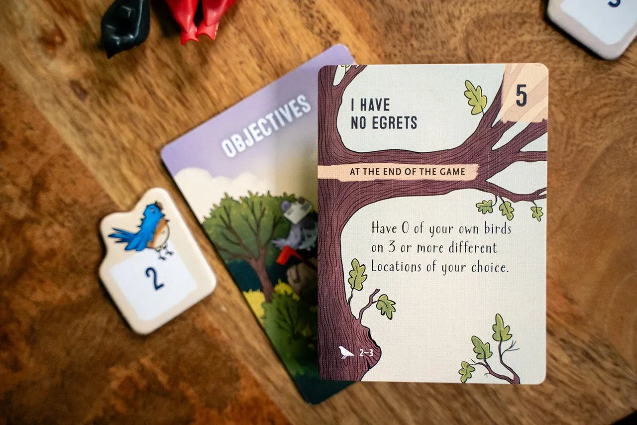 Each round, players add their birds into a shared bag. Players then draw birds of their own, and other players take turns stacking birds on location tiles. Each location tile will award variable points for majorities and sometimes grant players a unique ability. The game ends after five rounds, and the player who has earned the most points wins.