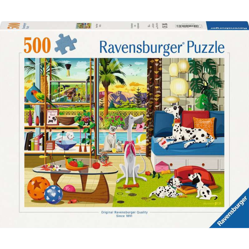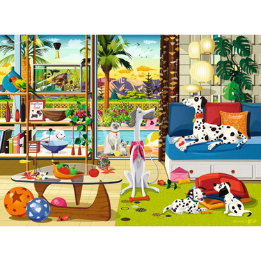 Enjoy the dry desert heat or stay cool indoors with our 500 piece jigsaw puzzle “Pets of Palm Springs” While the Dalmatian and his lady are exchanging love notes, the puppies are playing inside and out. Fun elements include the parrot perched on the shelf, the kitty cat looking for some playmates, and an aquarium complete with a sunken ship, deep-sea diver and a treasure chest.