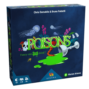 Poisons is a bluff-based card game in which players have to carefully weight their risks to earn points. Each turn, players secretly add a card from their hand to each opponent's drink: an innocuous liquid or a deadly poison. When everyone has their cup filled, each player decides whether they will drink the contents of their cup.