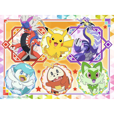 Enjoy puzzling this 100 piece bright and vibrant puzzle featuring Pokemon Scarlet and violet legands, Koraidon, Miraidon, Sprigatito, famous Pikachu and others! This is an absolute must have to any Pokemon fans collection!