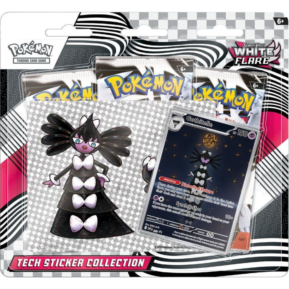 Gothitelle can see the future in the stars—perhaps it knows which path you’ll take! Team up with the Astral Body Pokémon as a foil promo card, then decorate your computer, tablet, or phone with durable tech stickers featuring the full Evolution chain: Gothita, Gothorita, and Gothitelle! Then, find more Pokémon first discovered in the Unova region when you open three booster packs from the special Scarlet & Violet—White Flare expansion!