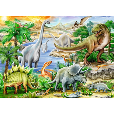 Enjoy some playtime with dinosaur moms and their young ones at the water hole in our “Prehistoric Life” puzzle — but watch out for T-Rex!
