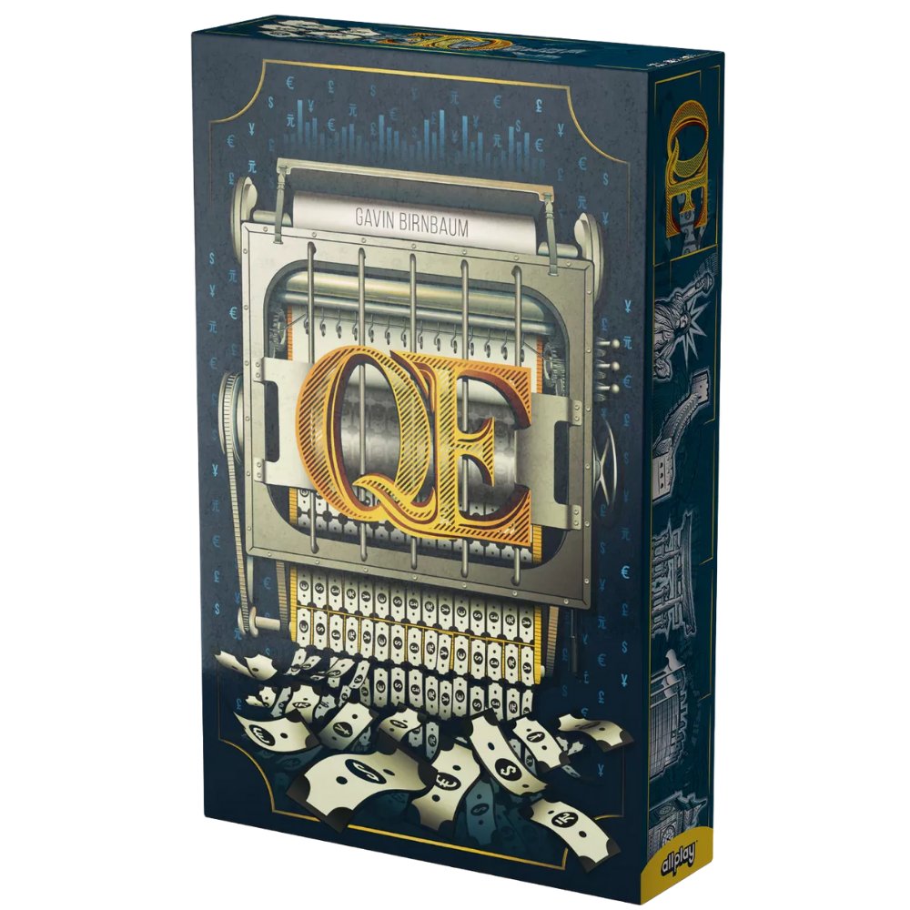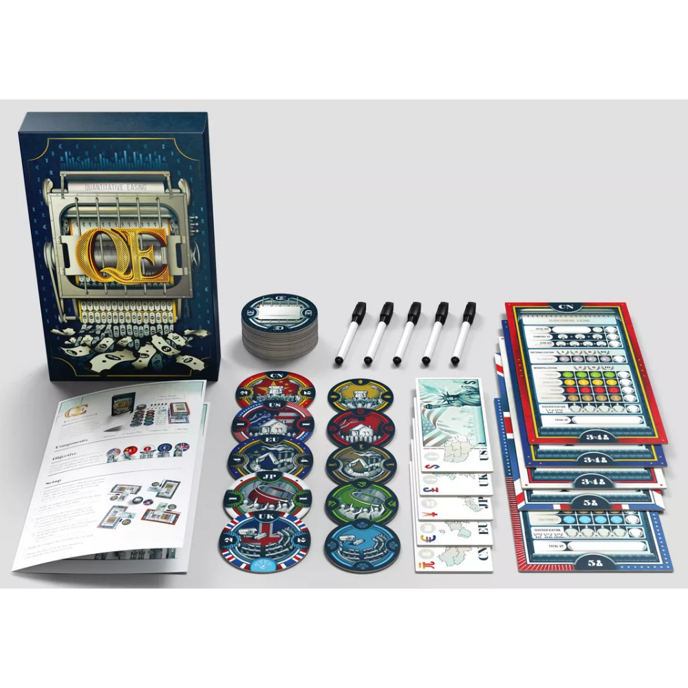 In Q.E., a term that stands for "quantitative easing", you play the role of a central bank. You bid on different size companies to accumulate various levels of victory points. The amount you bid is unlimited since you are the central bank and you own the printing press! After the initial "open" bid by the lead player, the other players bid in secret. After the sixteen companies have been "bailed out", bonus victory points are awarded for company sets of nationalization, monopolization, and diversification.