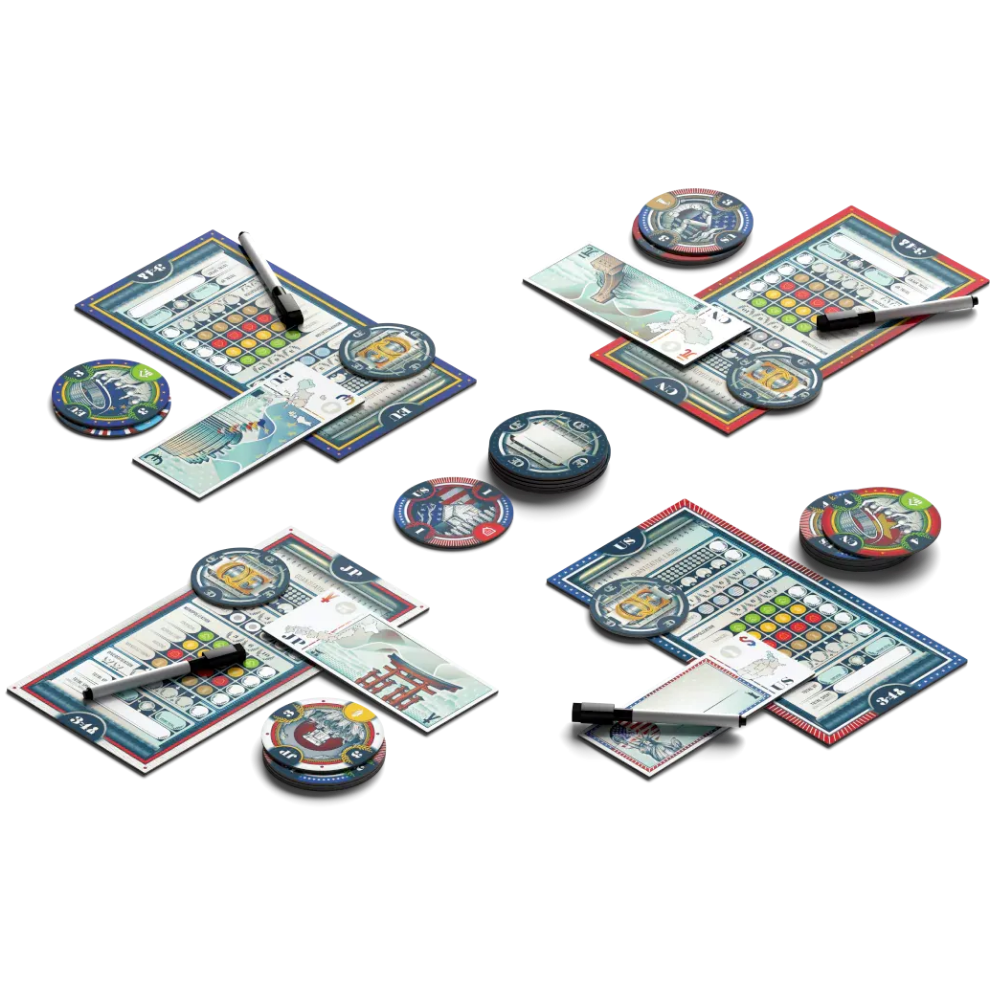 Previous editions of Q.E. supported up to four players, with a fifth-player expansion being available separately. This new edition of Q.E. is playable with up to five players out of the box.