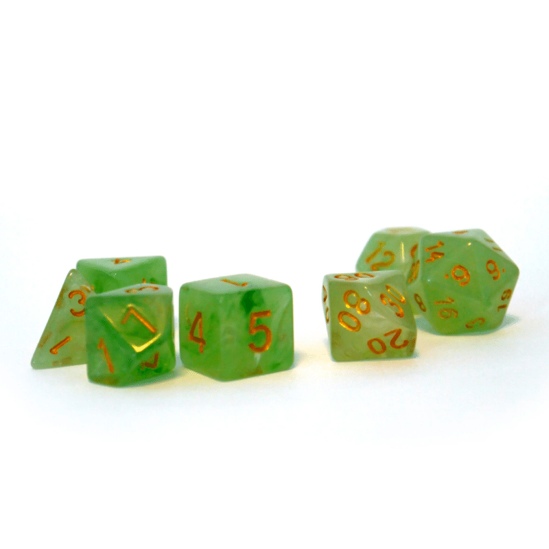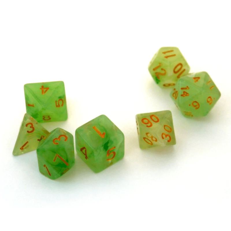 7-piece polyhedral RPG dice set consisting of the typical and relevant RPG dice: D4, D6, D8, D10 (0-9), D10 (00-90), D12 and D20.