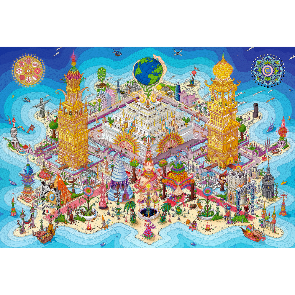 “Find your inner kingdom,” as Ruben Topia says. Amidst cultural and technological “advancements,” this Dutch artist inspires us to seek balance and peace as individuals, in myriad ways and in brilliant color. For some, that calls to mind contemplation in an Asian temple or the ancient atmosphere of Stonehenge. Others might find their center on a BMX bike ramp or while shore fishing the waters of life. Puzzle over this fantastic utopian landscape’s 1000 jigsaw pieces, and discover countless possibilities.