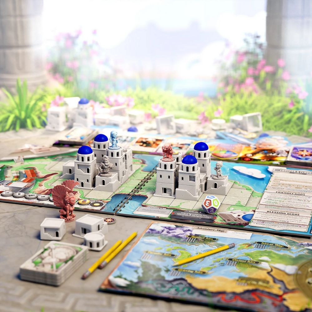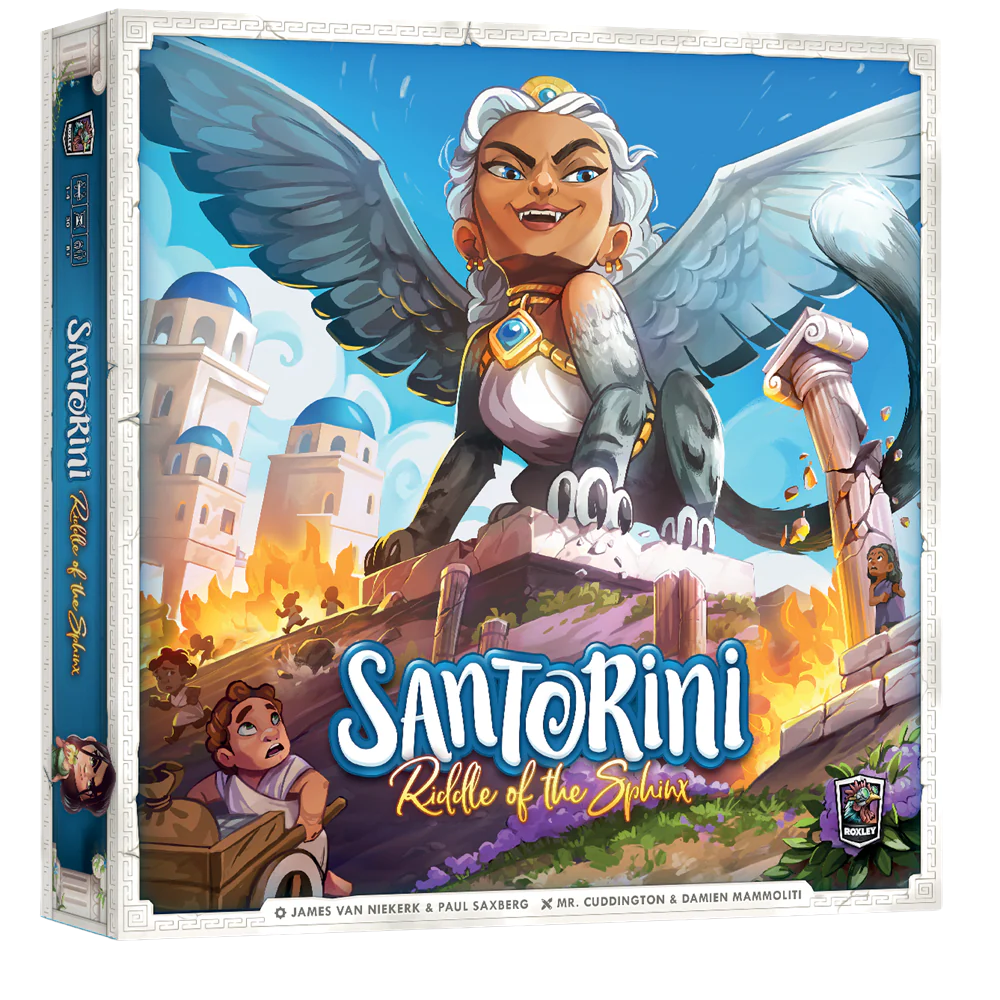 Santorini: The Riddle of the Sphinx is a co-operative expansion for Santorini that adapts the competitive experience into an ongoing adventure that players navigate together.