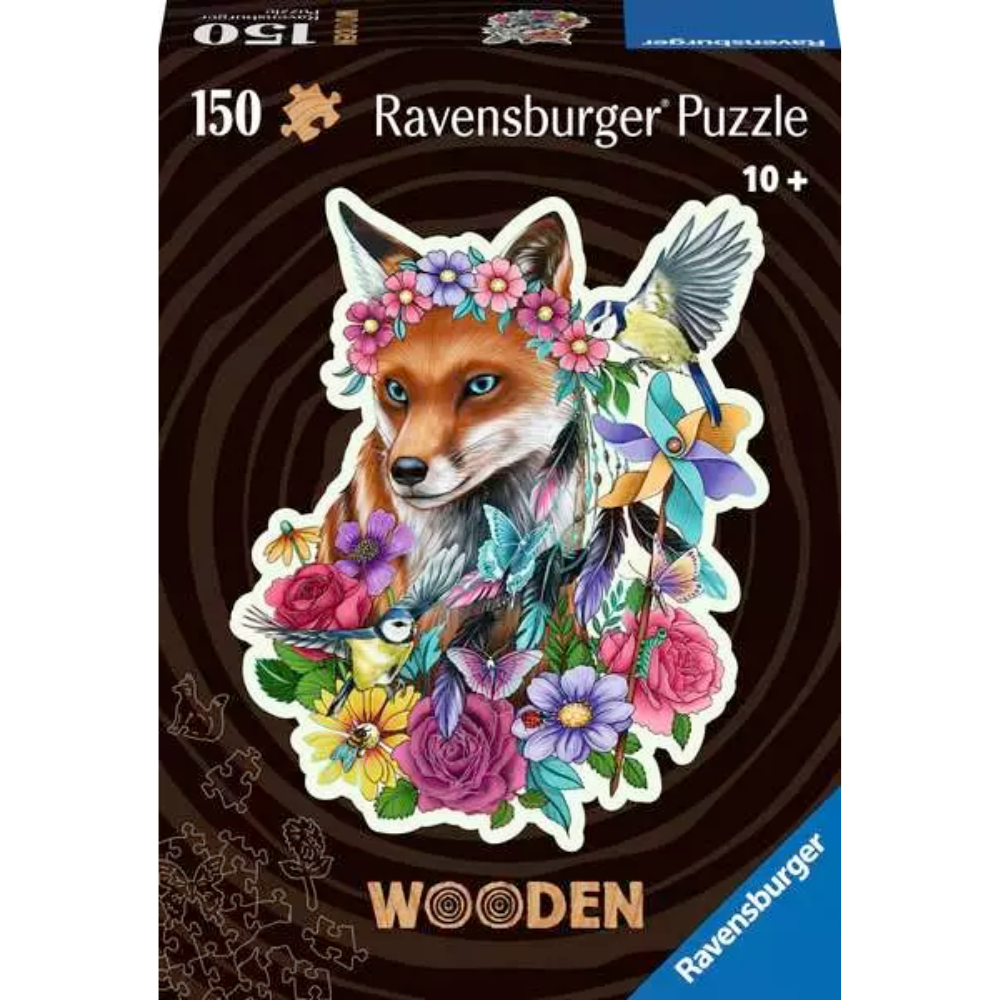 This friendly vixen pauses by a display of colourful flowers and is rewarded with a pretty hairband, delivered by a cheeky bird. Butterflies, bees and other creatures are drawn to the beautiful blooms, adding interesting detail to the finished puzzle. The image has a soft creamy-white surround, which frames the central scene and is a handy way to identify the outer puzzle pieces. The puzzle is laser cut to 150 intricate pieces in 4mm thick wood, including 15 shaped and themed "whimsies".