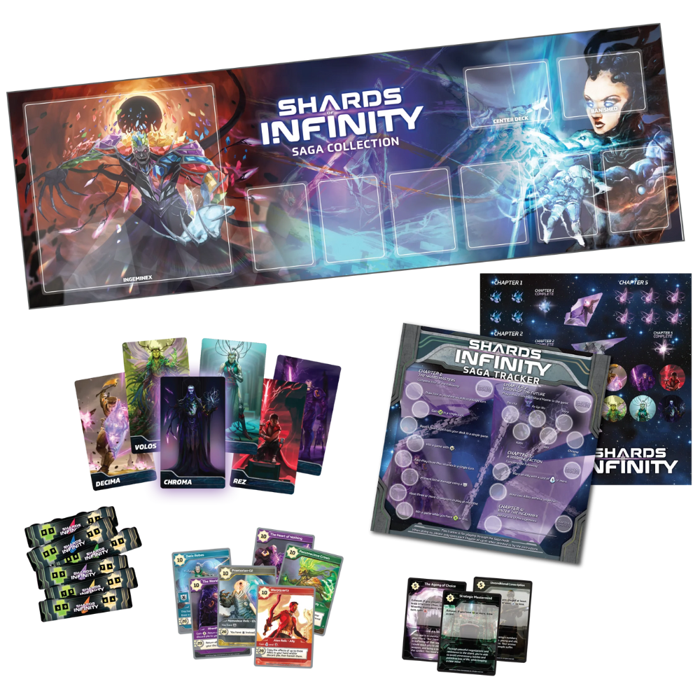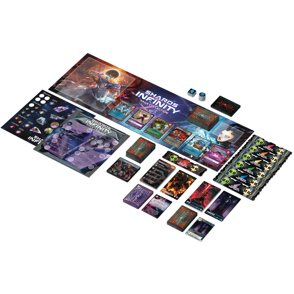 Shards of Infinity: Saga Collection is an entry point into the ever-expanding universe of Shards of Infinity as it contains the base game, all expansions, and all promo cards from the original edition, along with new and upgraded components. In addition to including the PvP, solo, and co-op modes, the Saga Collection introduces a new legacy mode that allows players to master gameplay from every set while delving into the game's lore. Additionally, the inclusion of a new Shard Master enables epic showdowns with up to six players.