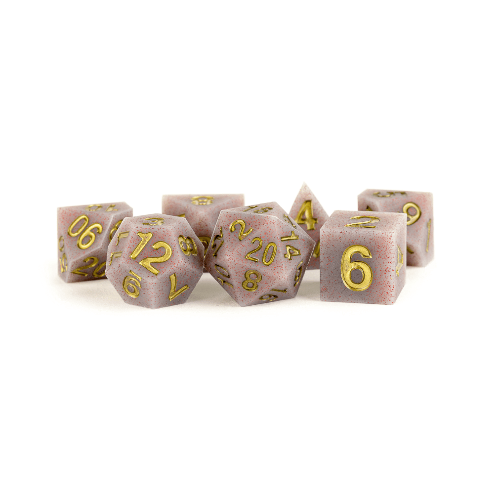 Each full-sized, 16mm set comes with 7 dice (d4, d6, d8, d10, d10% (00-90), d12, and d20).