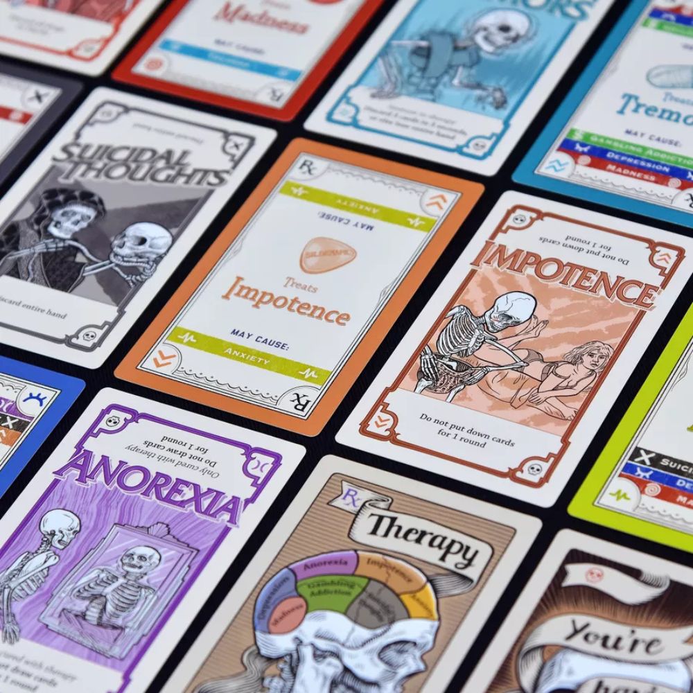 Drug use, personal demons, wild episodes, and more. Side Effects is a "take that" card game where players race to treat all the diseases in their psyche with medication and therapy.