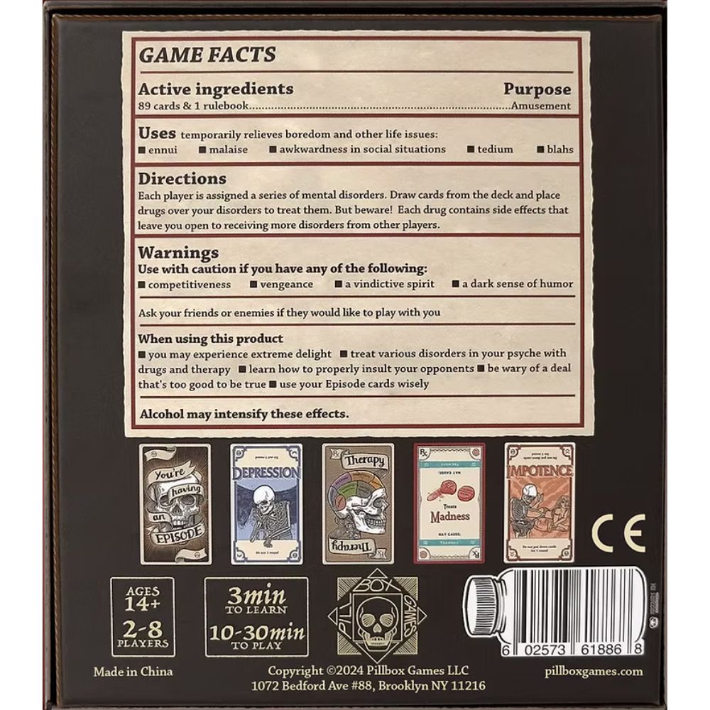 Players start with four disease cards dealt face up in front of them (their "psyche") and then four cards in a concealed hand. Players take turns picking up cards from the deck and trying to find the right drugs to treat their diseases. A drug card will treat a disease but also leave the player open to receiving new diseases (of that drug's list of side effects) from other players.