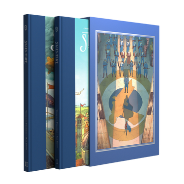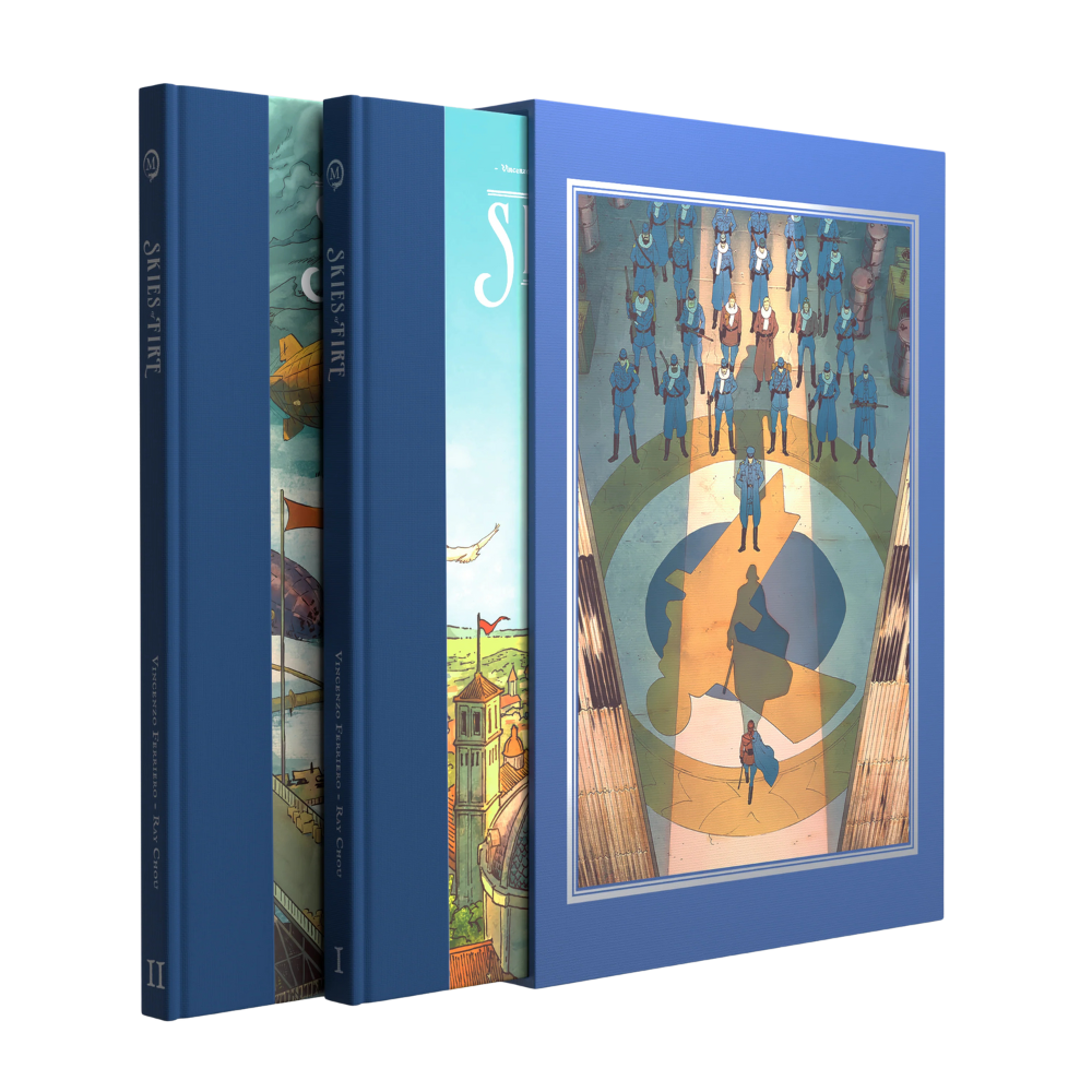 Books 1 and 2 complete the comic series' story arc. Each lovingly cloth-bound hardcover includes 4 issues of the epic comic series Skies of Fire. All variant covers created for the series are also included.