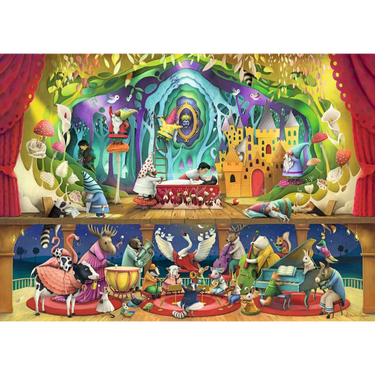 Delve into the heart of the enchanted forest, where two levels of magical stage scenes await your discovery. At the top level, witness the serene beauty of Snow White as she slumbers peacefully, surrounded by the industrious gnomes who potter about the stage, each engaged in their own charming activities. Below, a jubilant gathering of forest animals adds to the joining together to create a symphony of music and merriment. From the melodious tunes of the songbirds to the rhythmic beat of drums played by the moose, every corner of the scene is alive with joy and harmony.