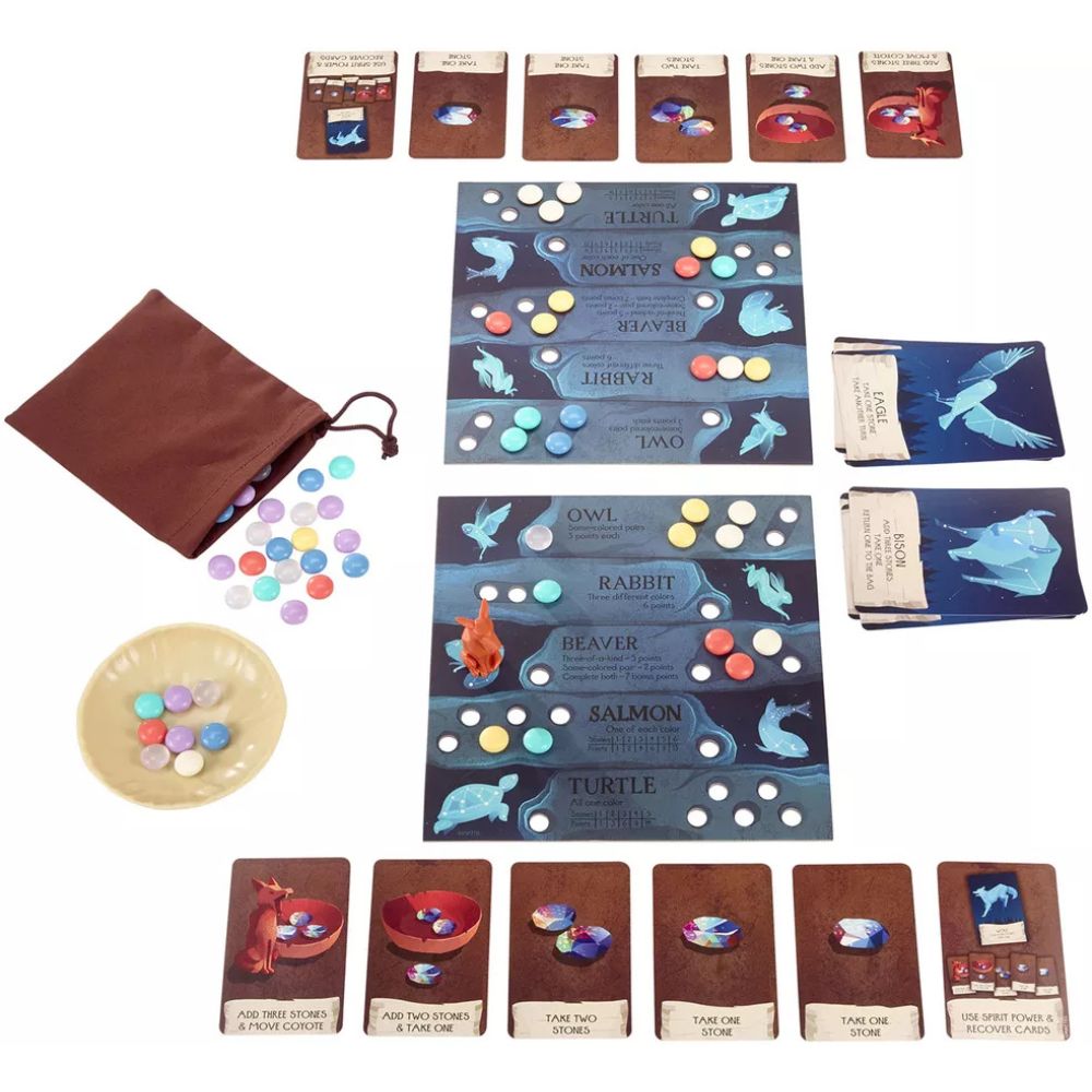 On your turn, you use action cards to draw or add stones to the bowl, use powerful spirit abilities, or send Coyote to distract your opponent. Always the trickster, Coyote prevents your opponent from giving stones to an animal of your choice, which might be just what you need to take the lead.