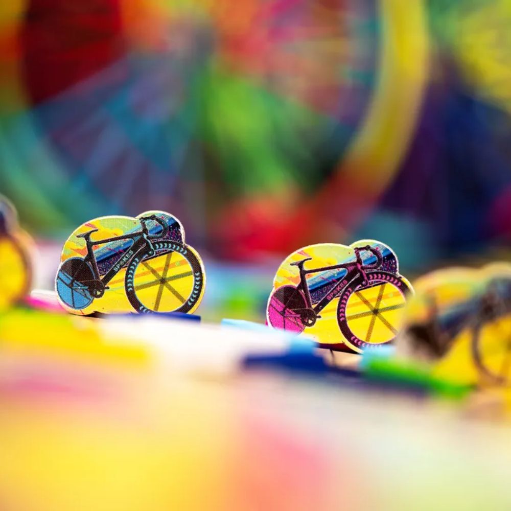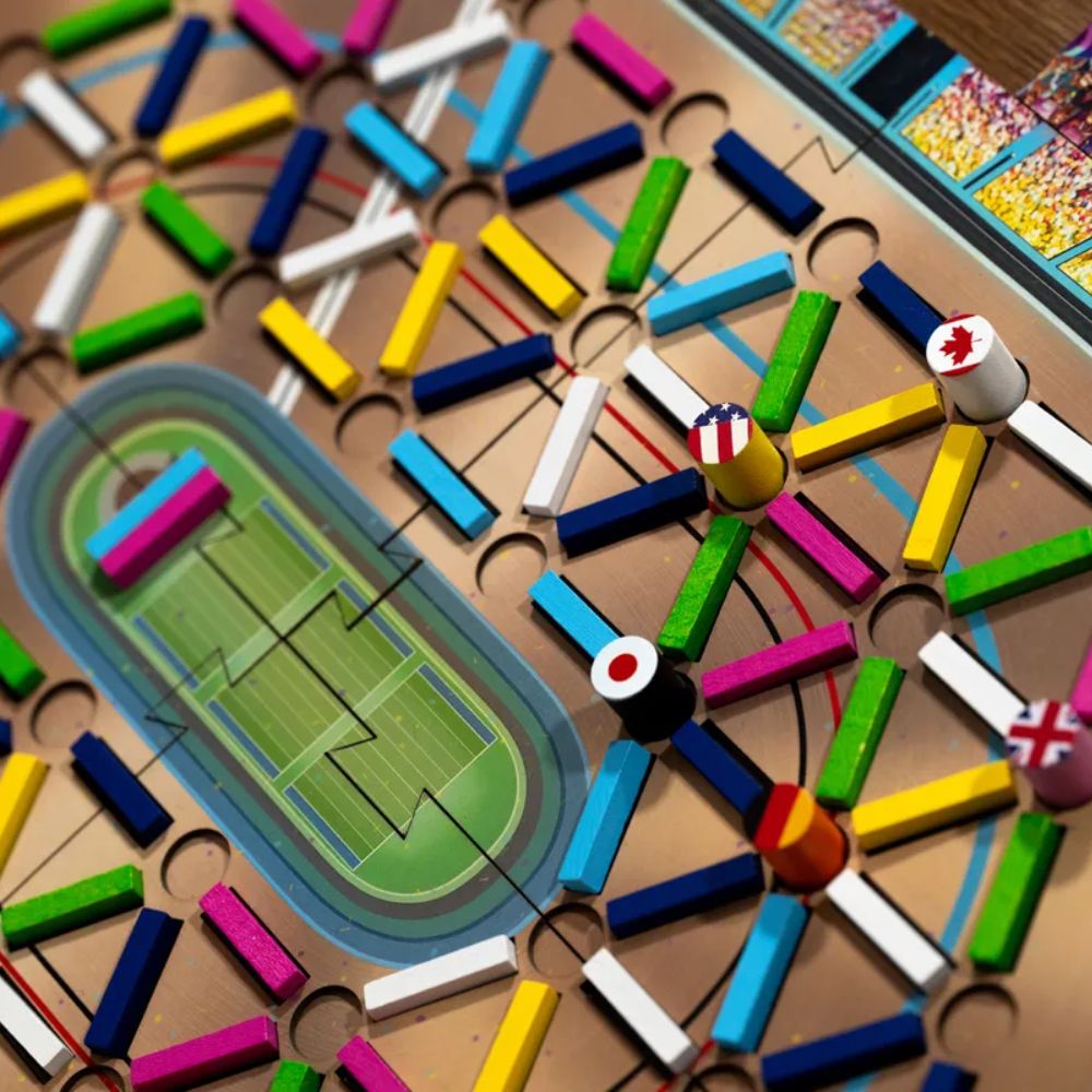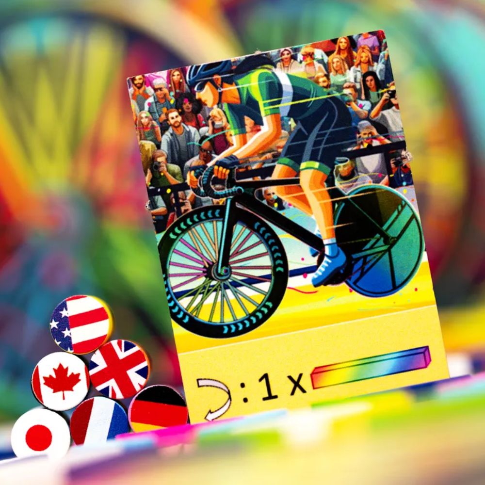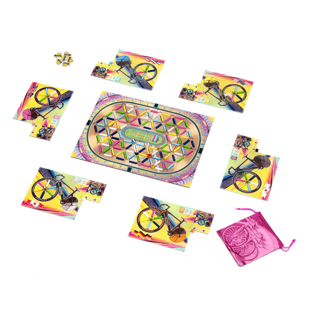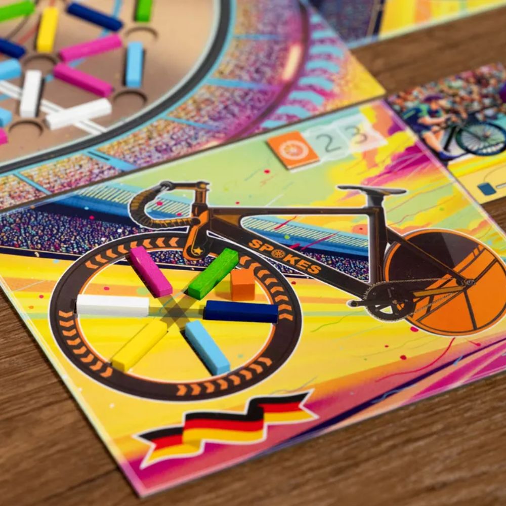 Each turn, players select a spoke on their wheel to swap for one on the track, then travel down a contiguously-colored track containing the spoke they placed. As the game continues, players build, share, and dismantle routes, managing the selection of spokes at their disposal for efficient cycling on the best routes. Play goes around the table until one player has completed three laps and wins.