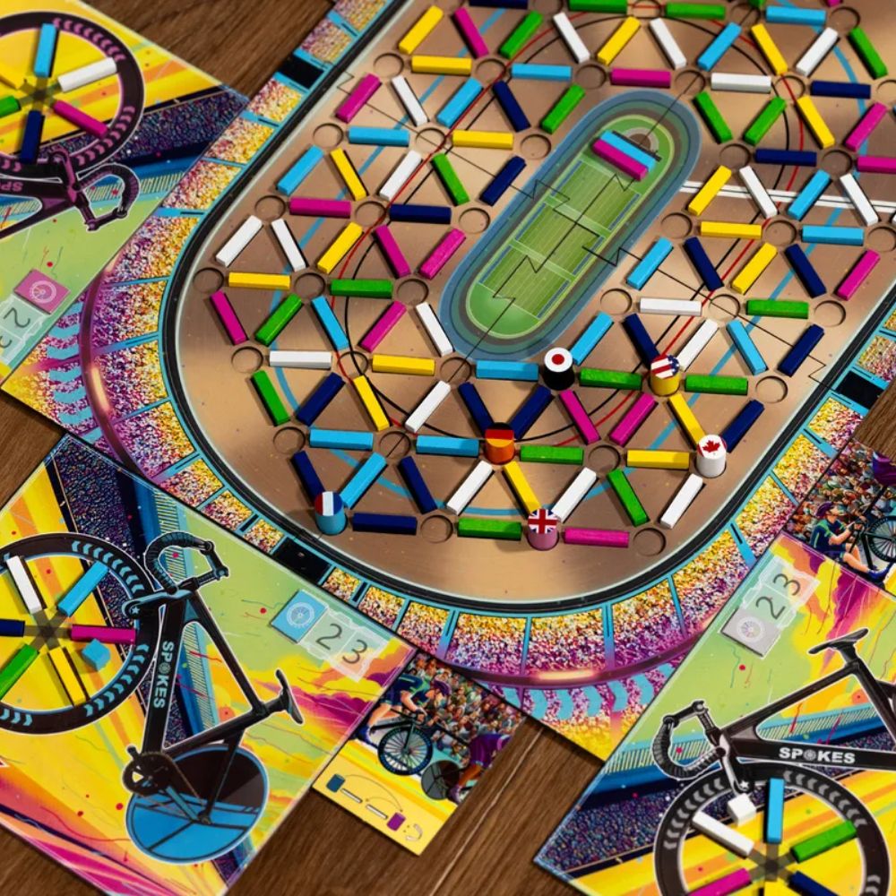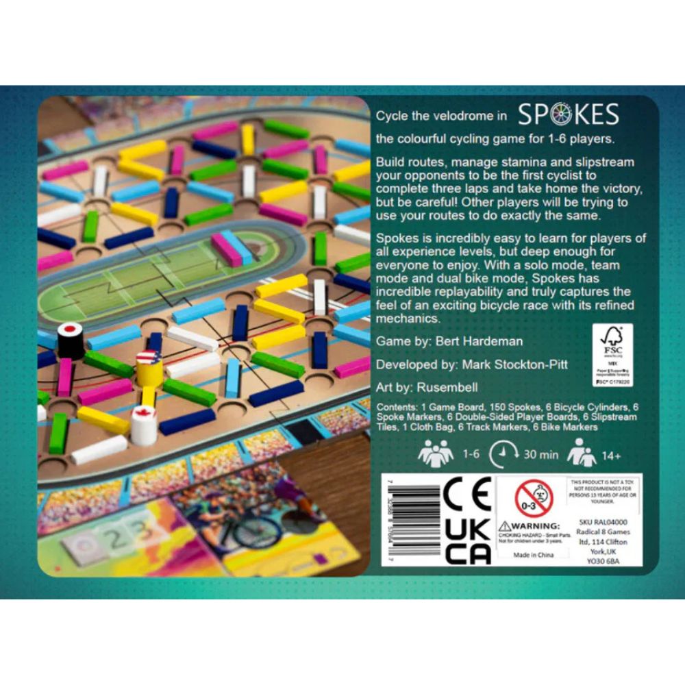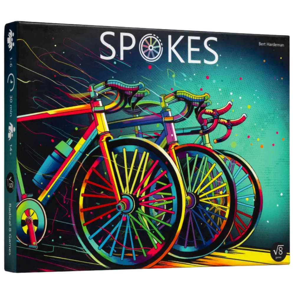 Spokes is a fast-paced cycling game in which players create cycle paths by swapping spokes from their wheels for those on the board, creating routes and changing options along everyone's routes, resulting in fast and dynamic play.
