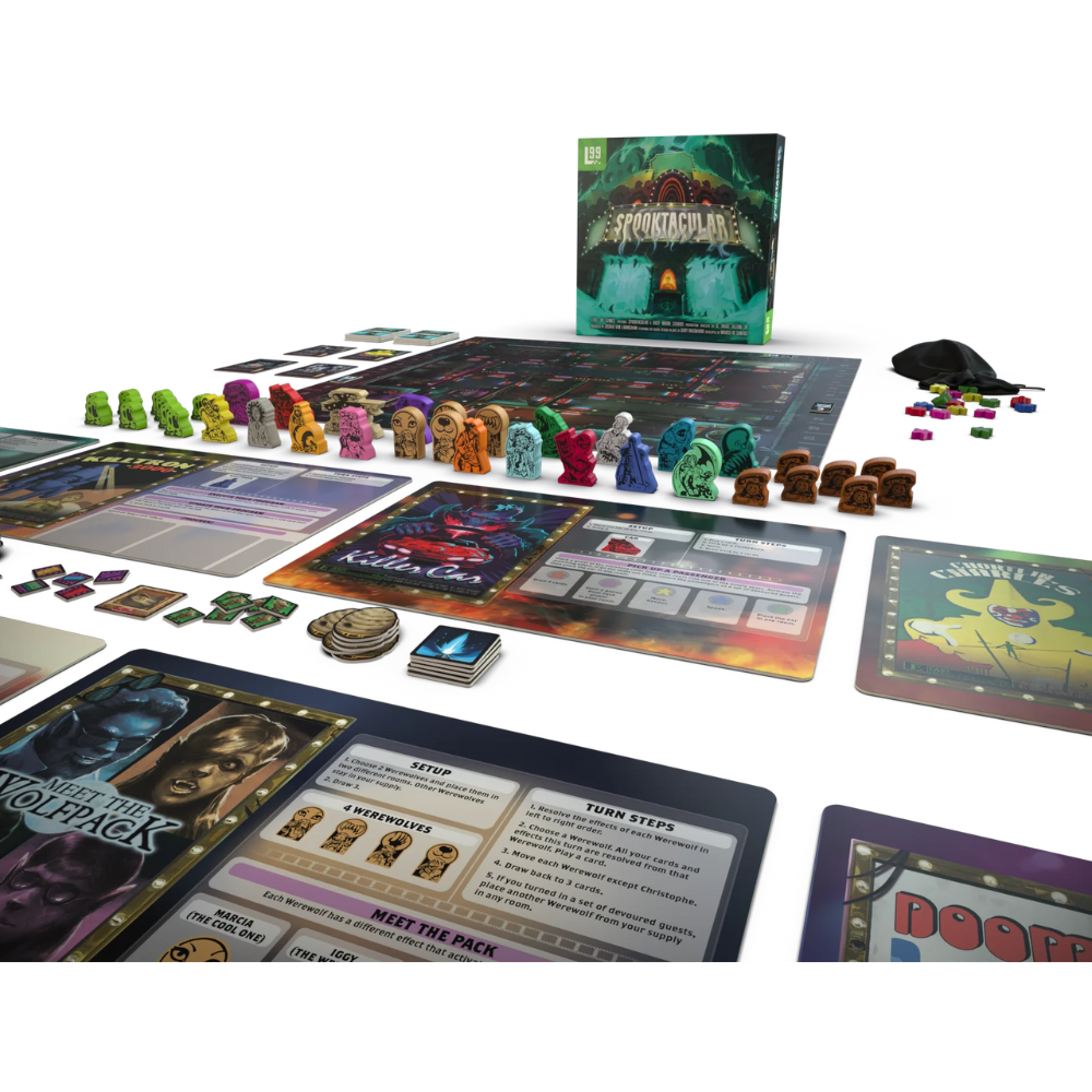 In Spooktacular, play as one of twenty movie monsters, each with their own way of playing the game. Easy to understand rules are the base of the game, and everything else you need to know is right on your monster board. Tons of variability and devious monster abilities to discover will keep you coming back to the theatre.