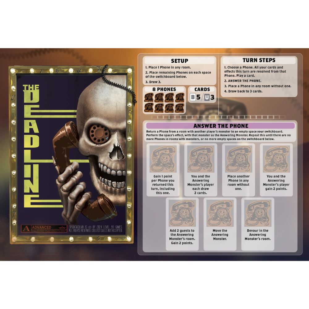 Spooktacular is played over a series of rounds. Players perform the turn steps on their monster in order, then pass the turn to the player to their left. Playing cards, adding guests, moving, spooking, devouring, and interacting with your monster’s unique abilities are common things you might do on a turn