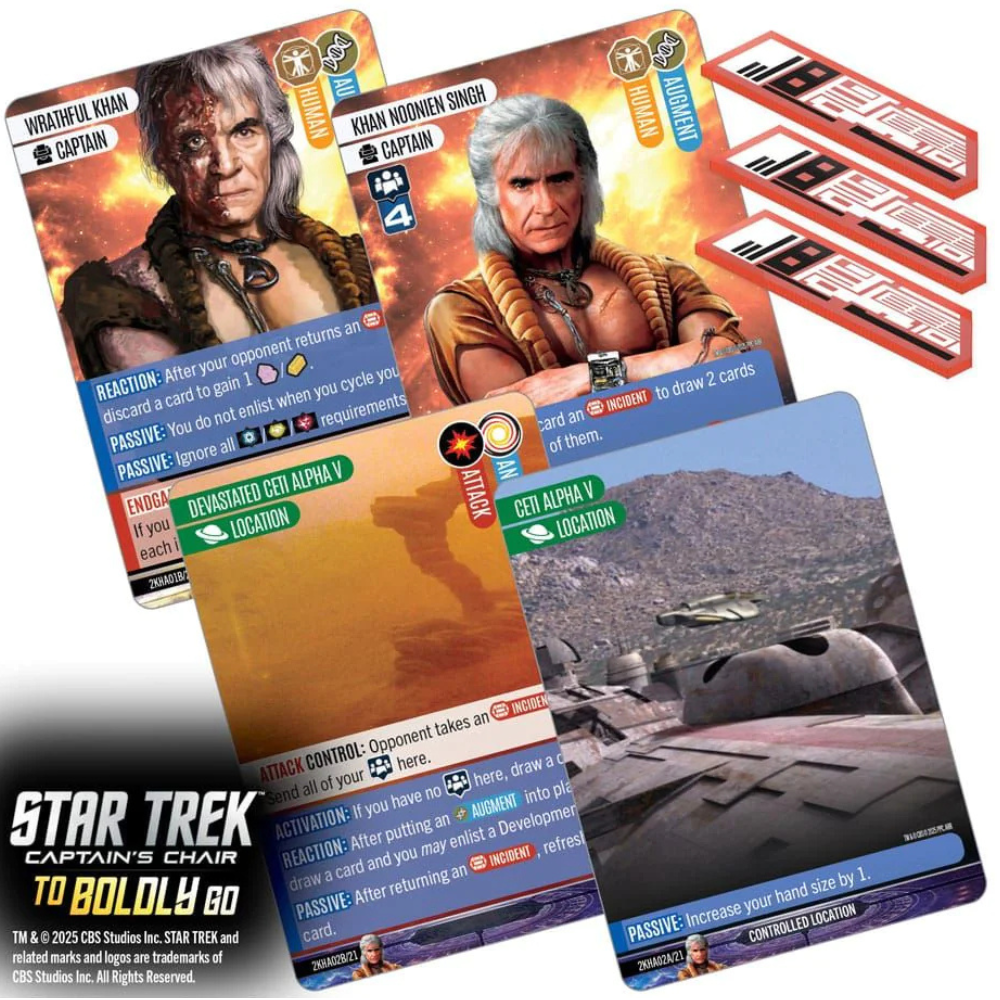 With To Boldly Go, you can play as James T. Kirk, Khan Noonien Singh, Philippa Georgiou from Star Trek: Discovery, Rebner, the Pakled Commander from Star Trek: Lower Decks, and more. Each of the six captains comes with a unique, asymmetric deck of cards that matches that leader's personality, abilities, allies, and assets. These decks can be expanded with cards available to both players, cards representing the people, items, planets, and events that characters encounter in iconic storylines. Each deck creates different strategic directions based on which common cards are available and what strategy your opponent deploys.