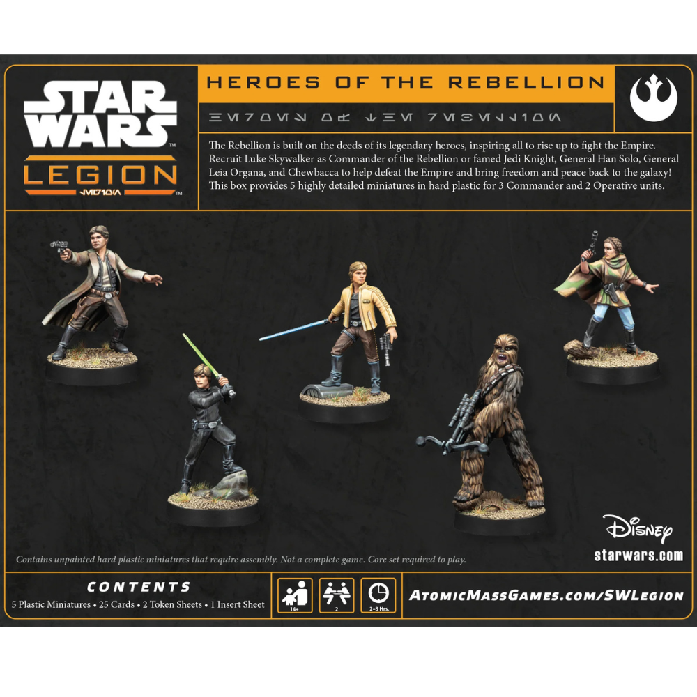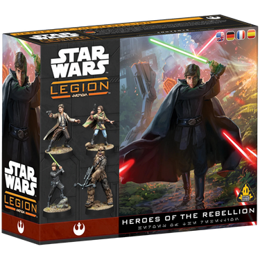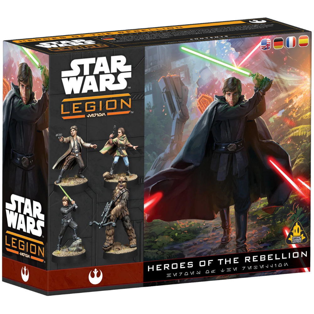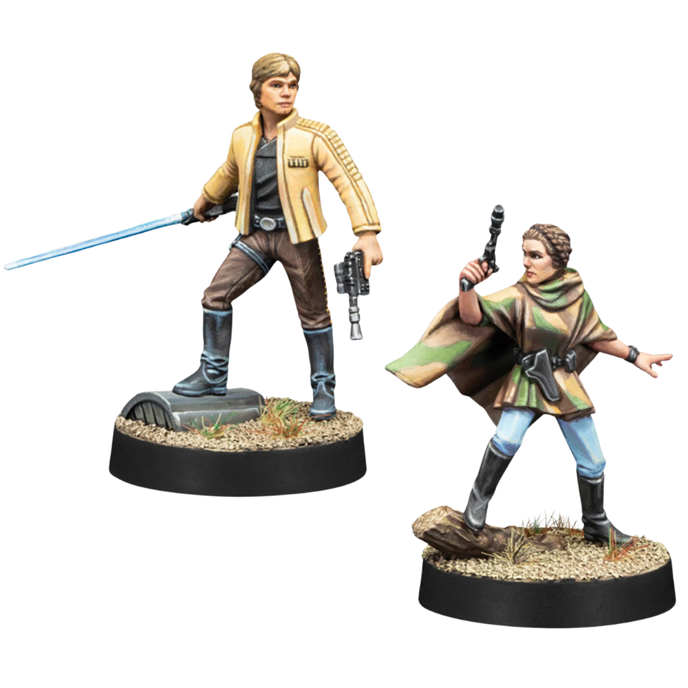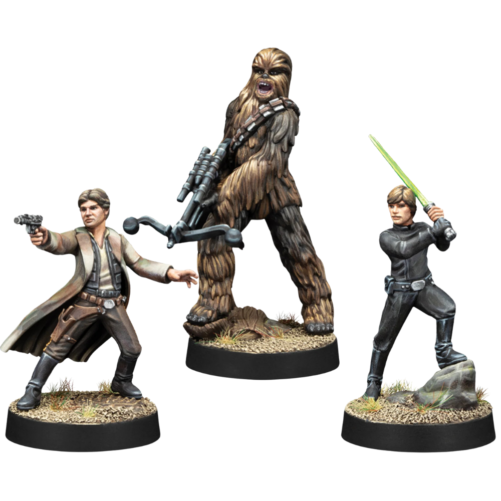 This Star Wars: Legion expansion contains Jedi Knight Luke Skywalker, General Han Solo, General Leia Organa, Chewbacca, and Commander Luke. These miniatures are now produced in a hard plastic, giving them more detail.