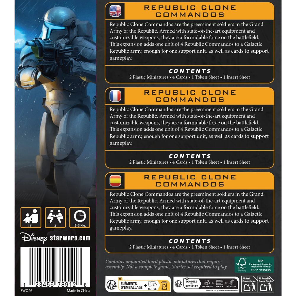 This re-issue product, previously SWL118, now SWQ26, brings the Republic Clone Commandos to the refreshed Star Wars: Legion. With updated packaging, featuring new art, along with updated cards to the new SWQ multilingual format, this product is an exciting product for Galactic Republic army players.
