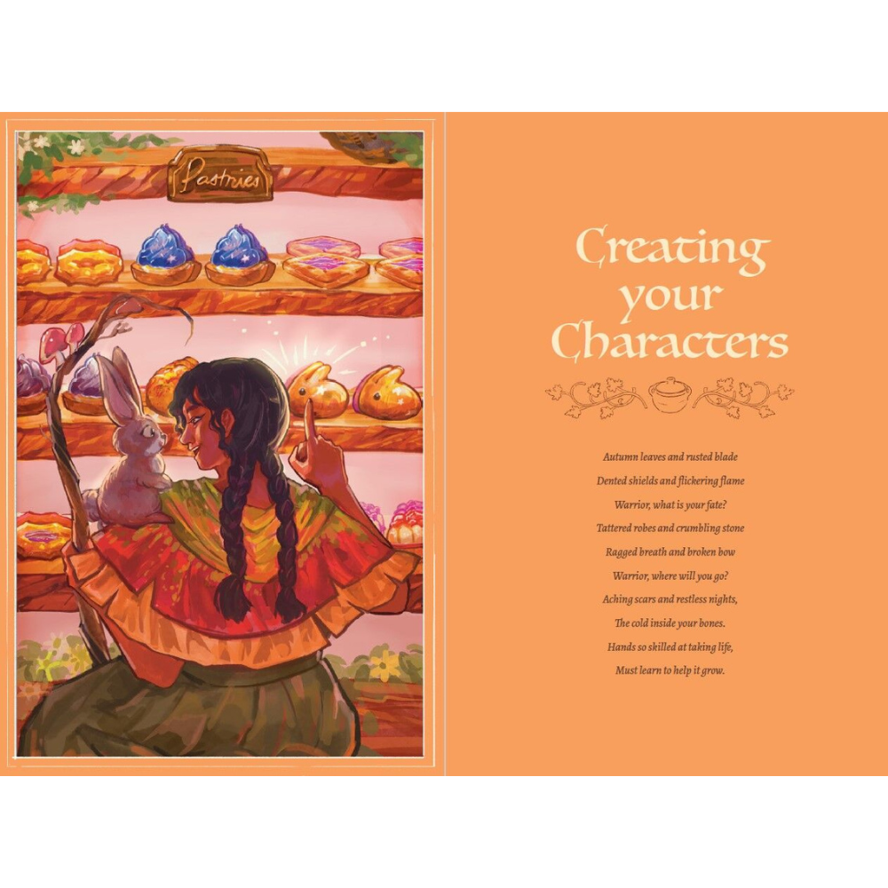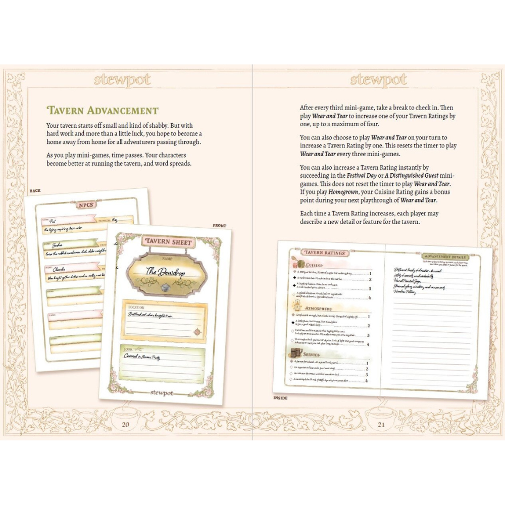 Stewpot is divided into a series of slice-of-life scenes, with a different set of simple rules and prompts helping adjudicate each scene. You might be scrambling to cook something edible with random ingredients, bartending for troubled souls, calming down a tavern brawl, going shopping for all the things a tavern needs, and more! Work to upgrade your tavern’s cuisine, atmosphere, and service. In the process, you might just learn a little bit about yourself – and your fellow party members.
