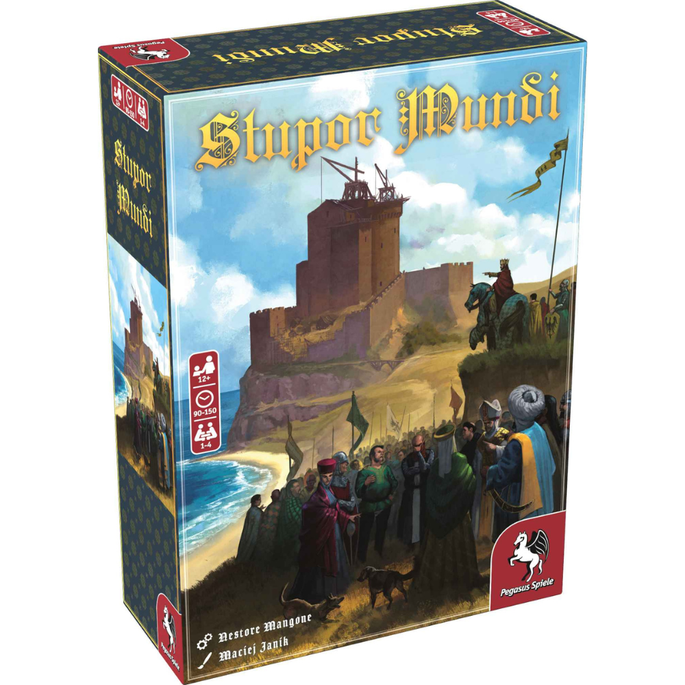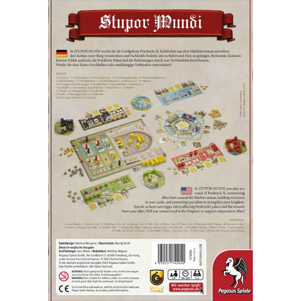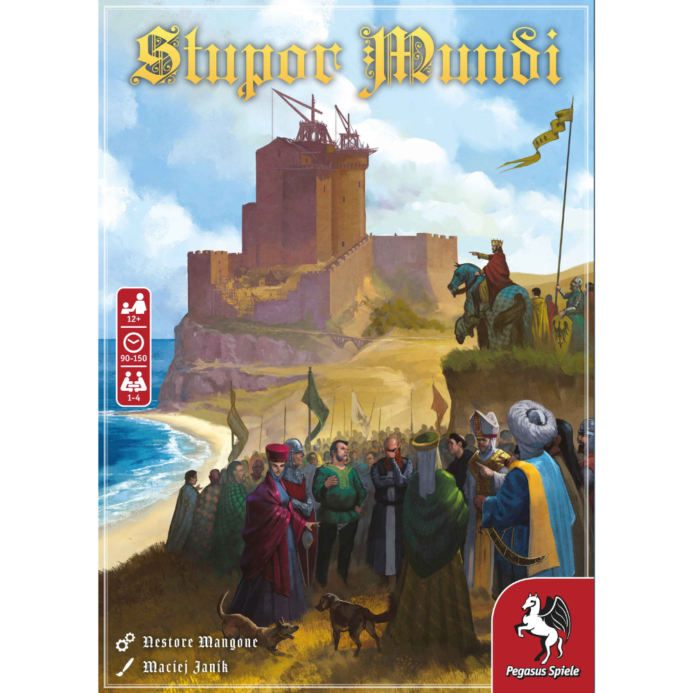 As one of Frederick II's vassals in Stupor Mundi, you will summon allies from around the Mediterranean, build structures in your castle, and promote specialists to improve your kingdom. You may improve your chances by upgrading your castles: towers house additional allies, walls store more resources, and keeps aid in managing action cards. Through a clever card-selection mechanism, you will have to choose actions carefully, some of which will trigger edicts that affect Frederick's palace, and determine the rewards players may receive from their allies. Do you stay loyal to the Emperor, or do you support independent allies? Keep a close eye on what your opponents do and form alliances at the right time — or go your own way when things get too heated...