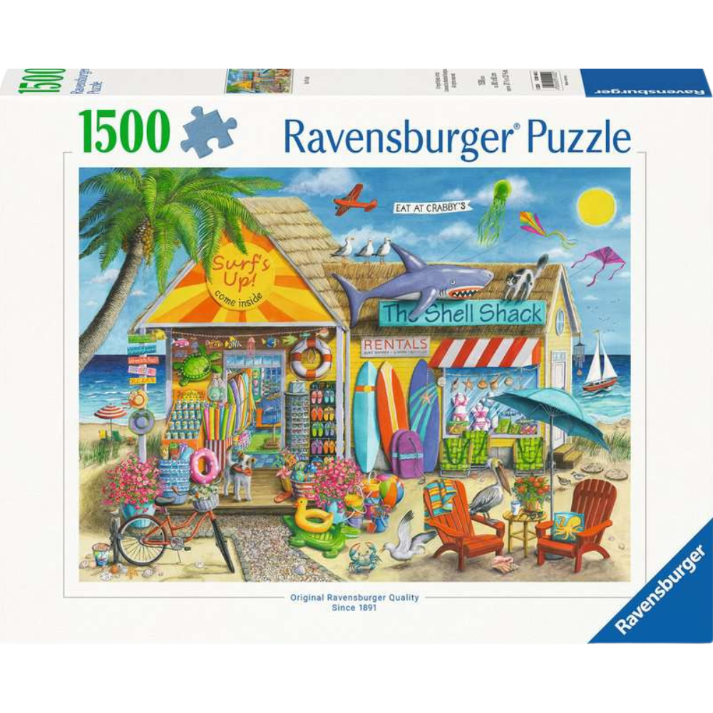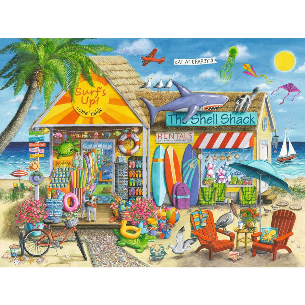 Dive into the ultimate beach day with this cheerful and bustling coastal scene! From the bright "Surf's Up!" shack to the playful Shell Shack next door, every inch of this puzzle is full of summer fun. Explore surfboards, flip-flops, beach toys, seashells, and colourful signs as seagulls soar and kites dance in the sky. Palm trees sway, waves roll in, and curious animals peek around every corner—there’s even a cheeky shark on the roof!