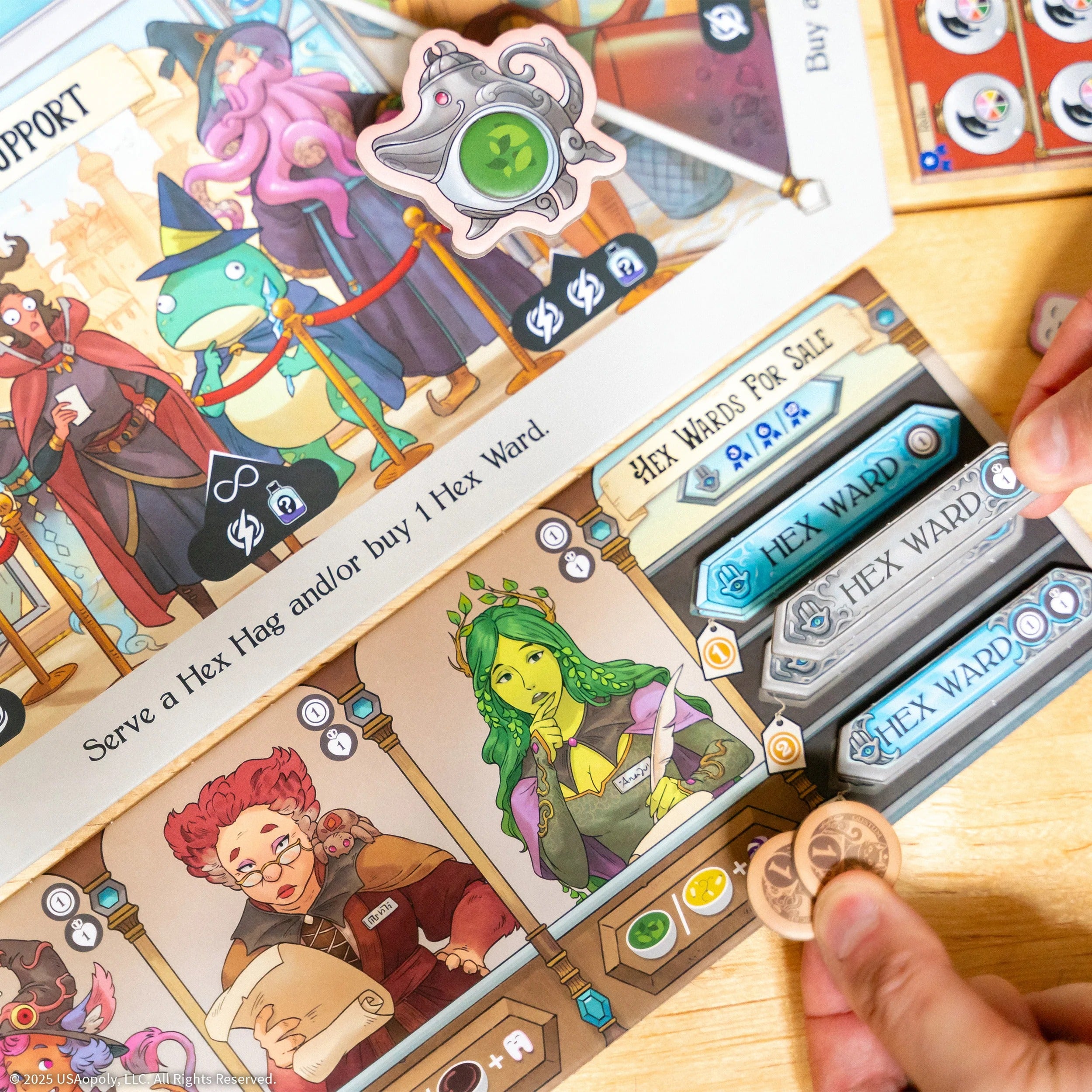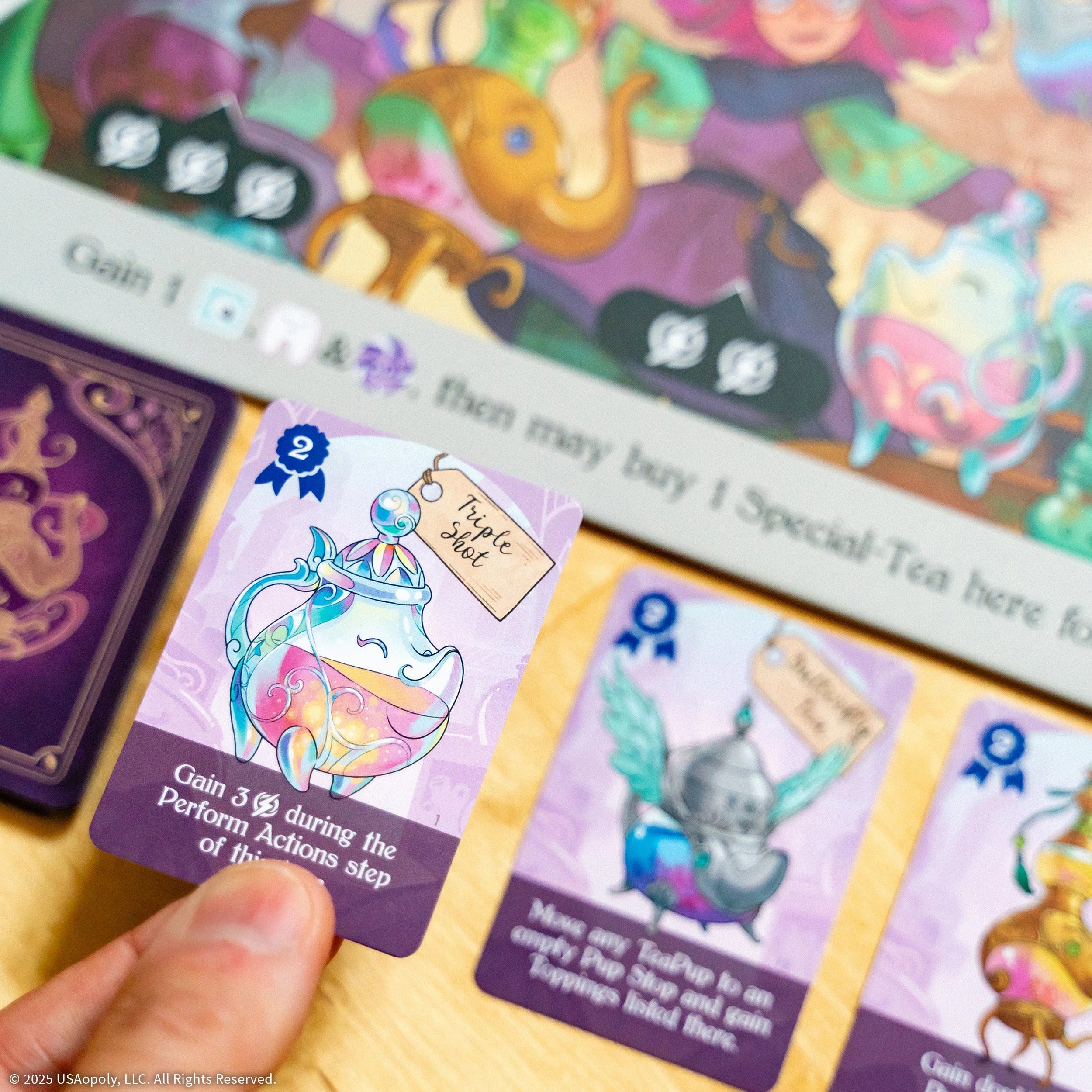 In the service phase, players take turns sending their adorable TeaPups to various Bootiques in the city to gather toppings and collect tea from the rotating crystal fountain in order to serve witches waiting at their hut. Additionally, TeaPups can help players collect powerful upgrades, attract Celebri-teas, and brew up Special-Teas with bonus abilities. Clever TeaPup placement can also help you complete to-go orders for witches out and about in the city center.
