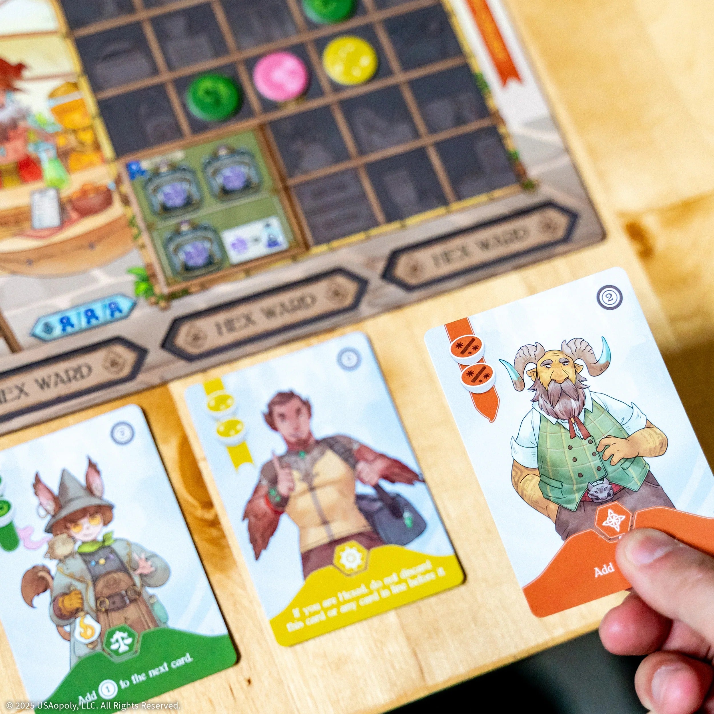 The game lasts four rounds, each representing one day of the Teaquinox Faire. Each day has two phases. In the summoning phase, players simultaneously draw a crowd of witches to their tea hut, being mindful not to push their luck too far as any identical witches will cause a hex, which results in witches leaving the queue.