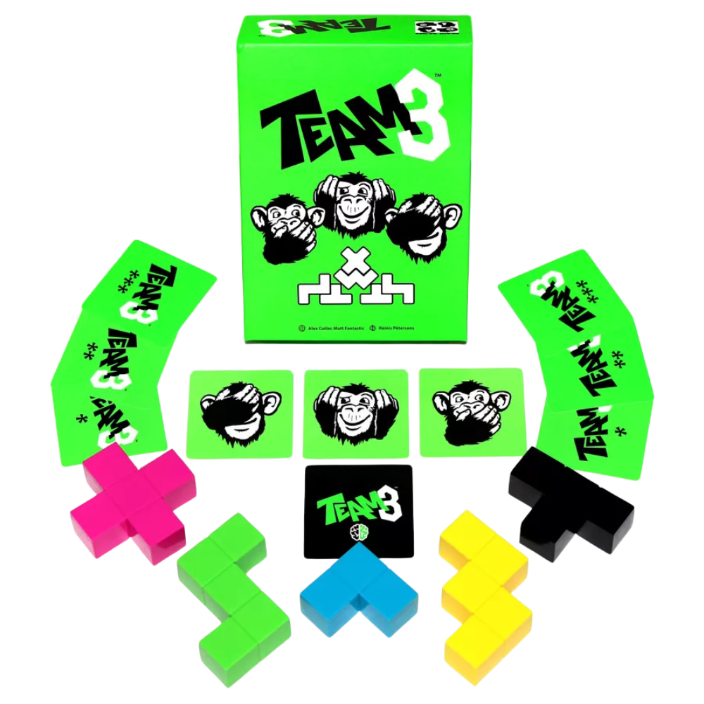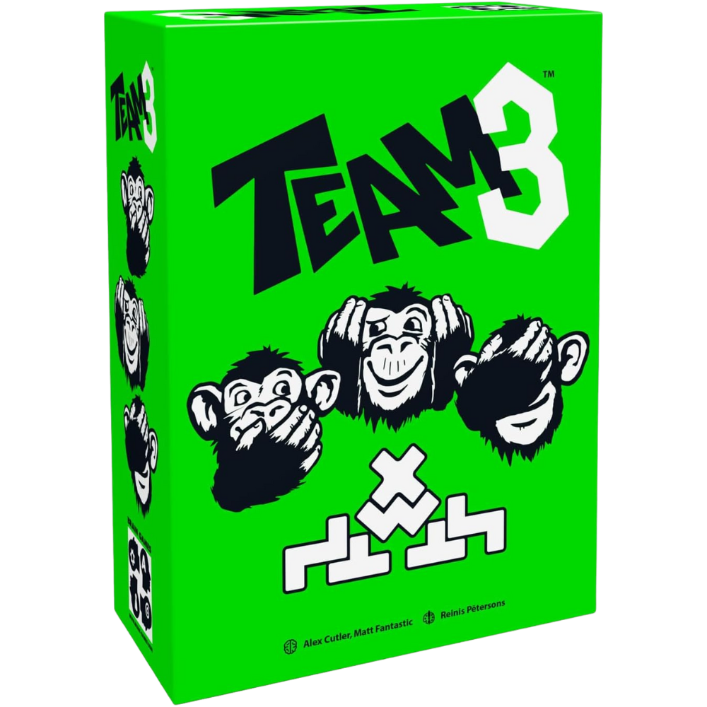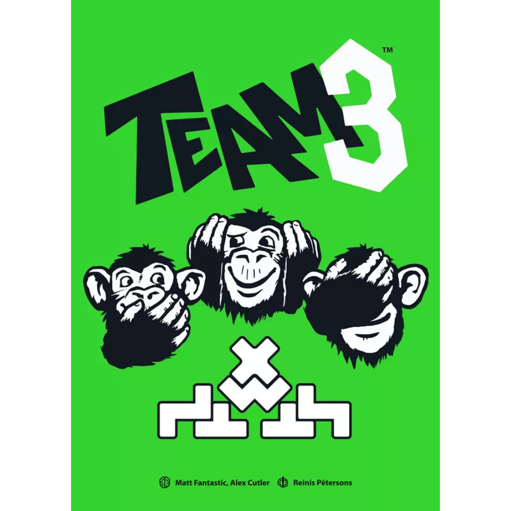The game of TEAM3 GREEN is played in teams of three players, with each player taking on the role of one of the three monkeys: the monkey who can't speak, the monkey who can't see, or the monkey in the middle.