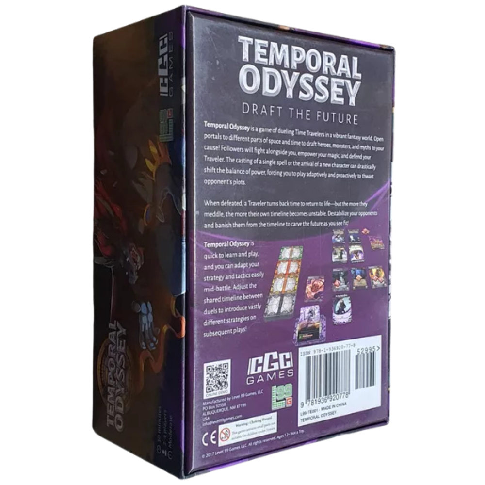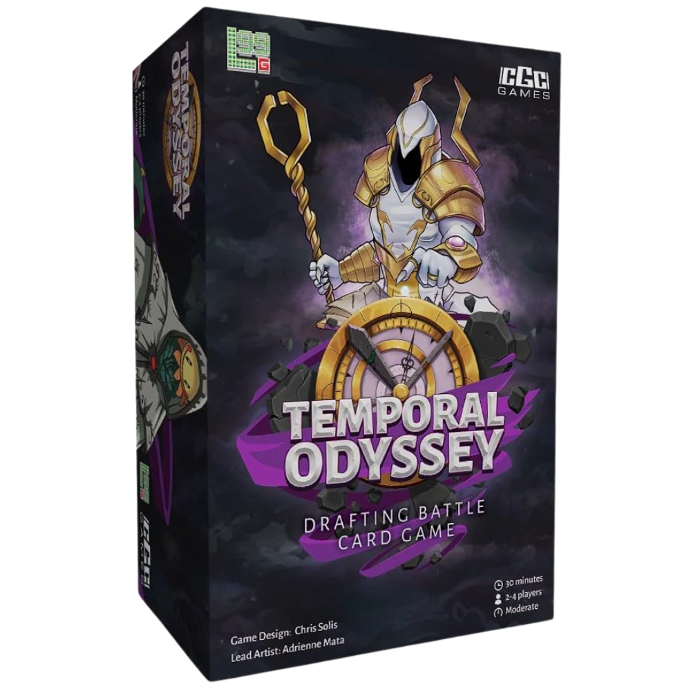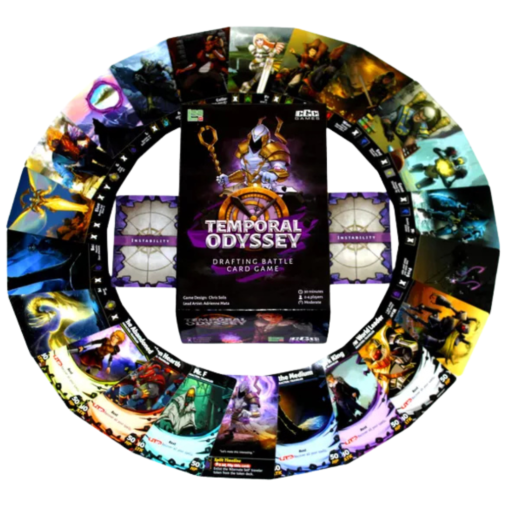Temporal Odyssey is a drafting battle card game about duelling time travellers for 2 and 4 players. Draft from the past, present, or future, and enlist legendary heroes and creatures to fight by your side. Group your characters to get them to share their abilities, using this both offensively and defensively. Regroup often to adapt to the situation. Rewind time to prevent your own death but be careful — each time you must suffer judgement from Lovox the god of time. Destroy your opponent's stability and deliver the final blow to banish them from the timeline and win the game!
