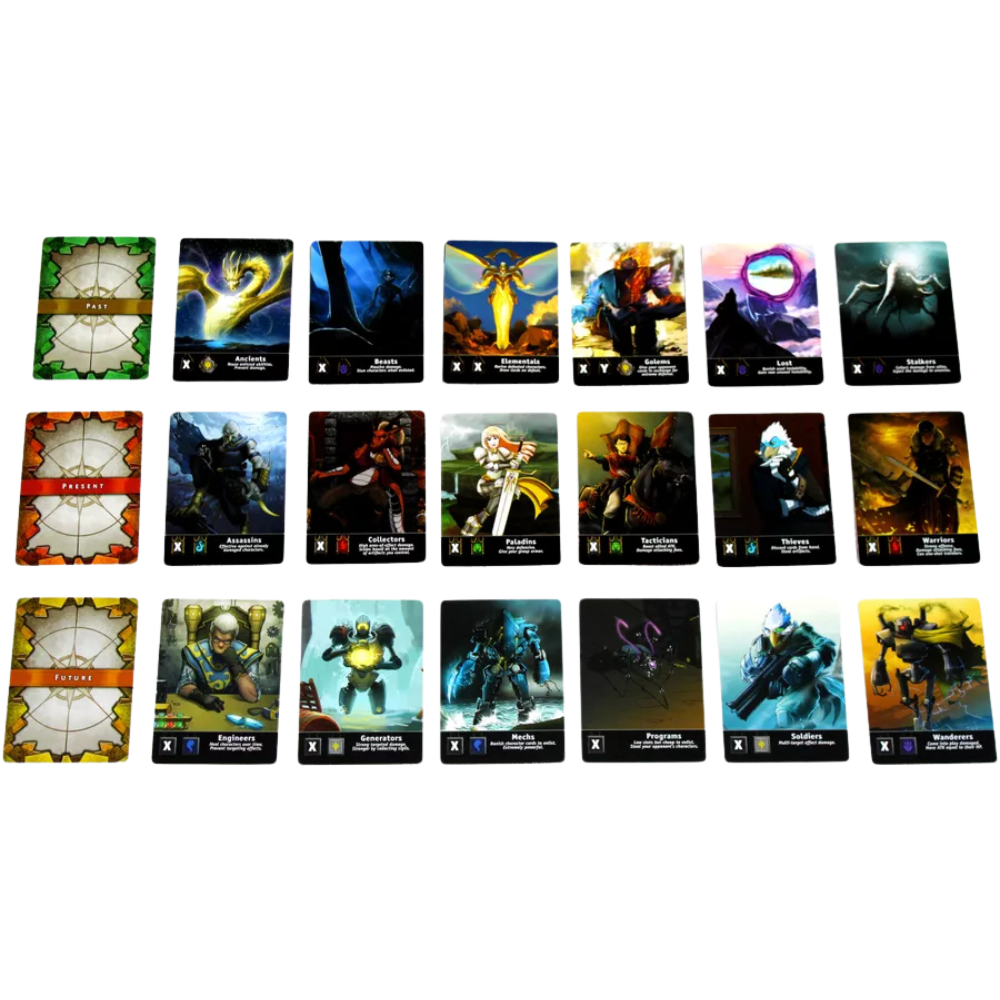 Draft cards from the Past, Present, and future decks and enlist epic characters to banish the other Traveler from the timeline! Each time period has its own theme and mechanics, and each class has specific uses and value depending on the situation and your Traveler's needs. Each card you draft provides elemental power. Collecting certain elements will level up your Traveler's spells, enabling power plays that can shift the pace of a fight dramatically. Each Traveler uses each element differently, and can greatly affect how you prioritise your drafting and banning.