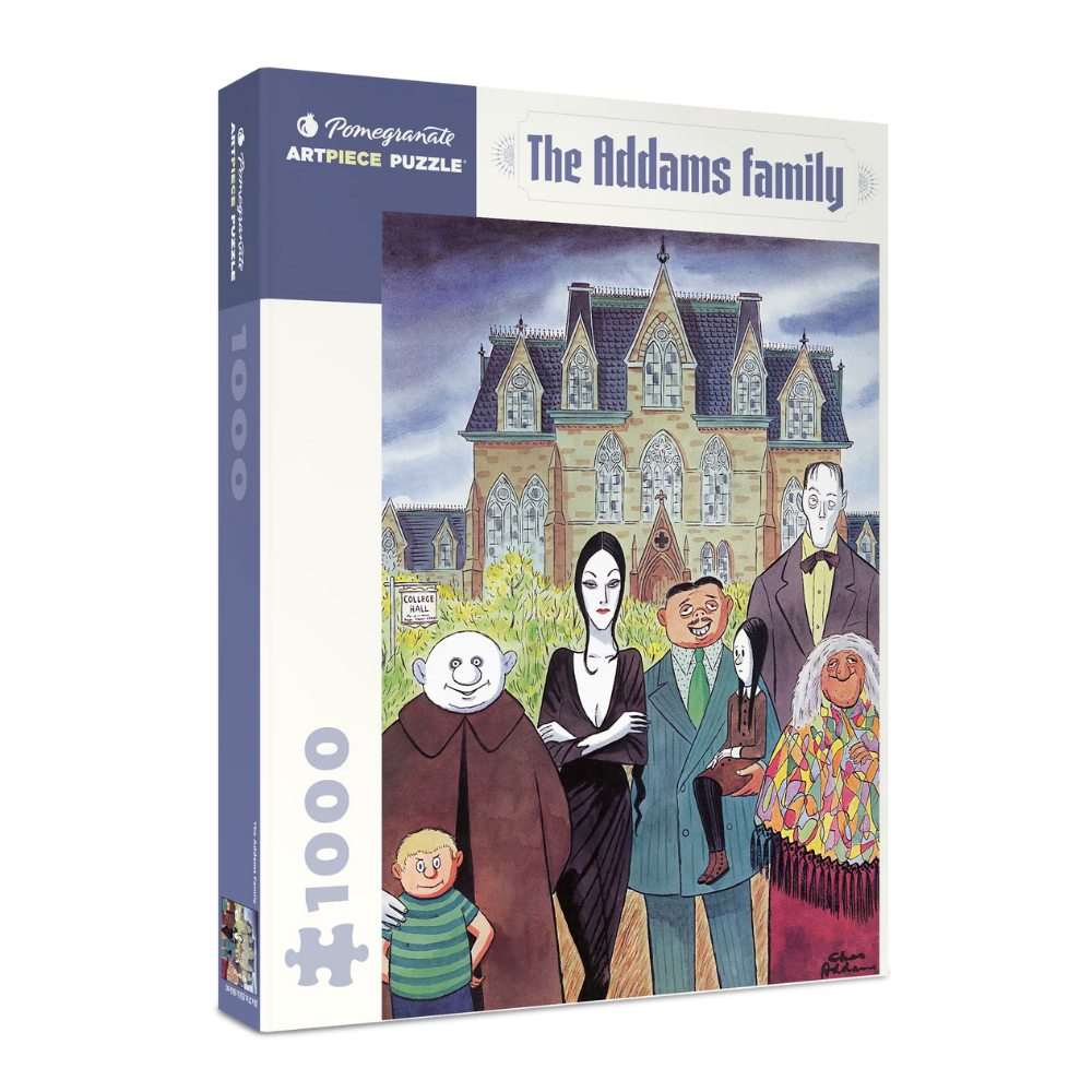 The delightfully frightful Addams Family has tickled the dark side of the public’s funny bone for nearly 90 years. With the creation of Morticia, Gomez, Uncle Fester, and the whole quirky gang, Charles Addams put a satirical spin on the “ideal family.” His eccentric characters have become icons of popular culture, from cartoons in to television series, feature films, a Broadway musical, and much more. Revel in Addams’ deadpan wit with every piece in this 1000-piece puzzle!